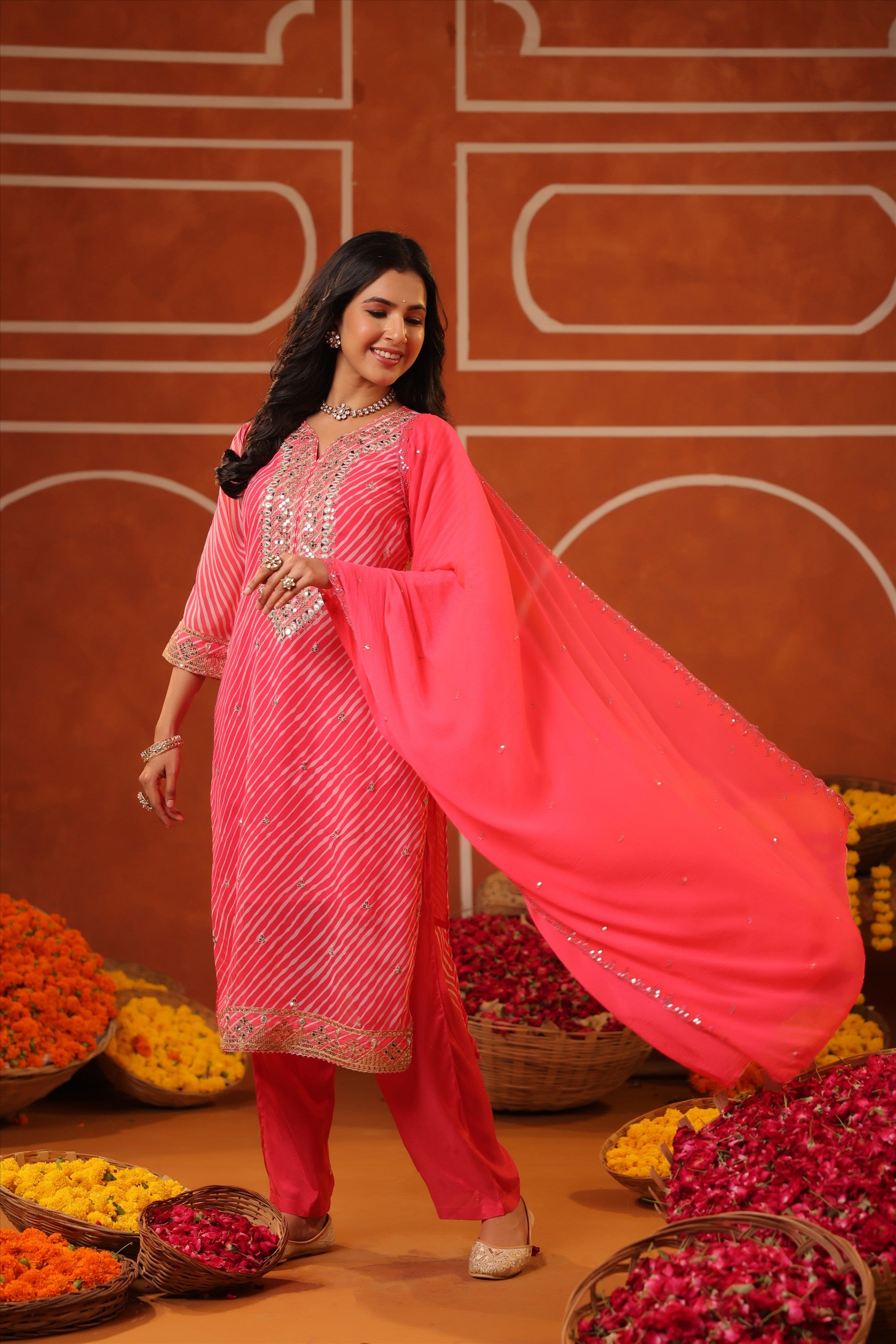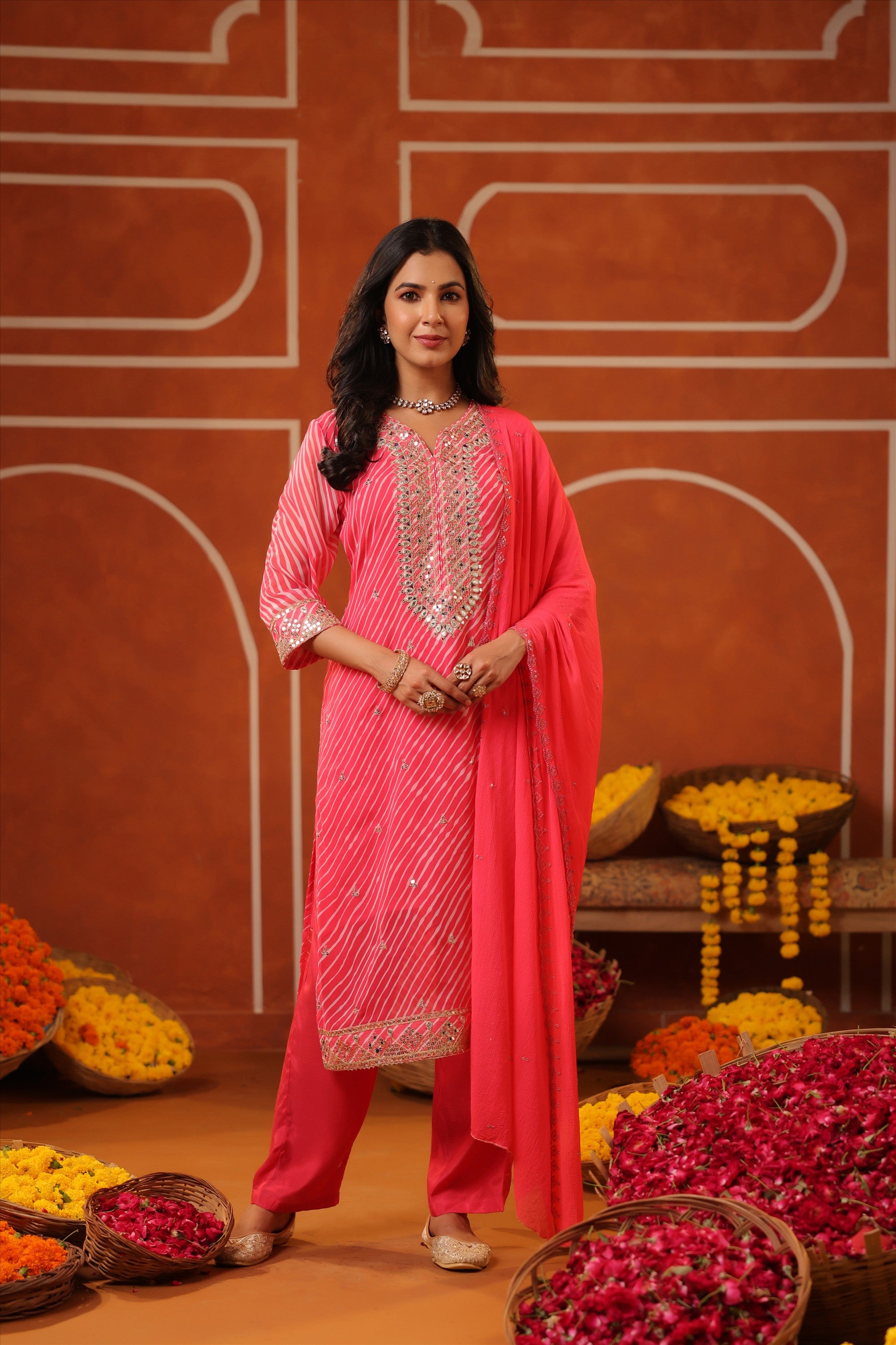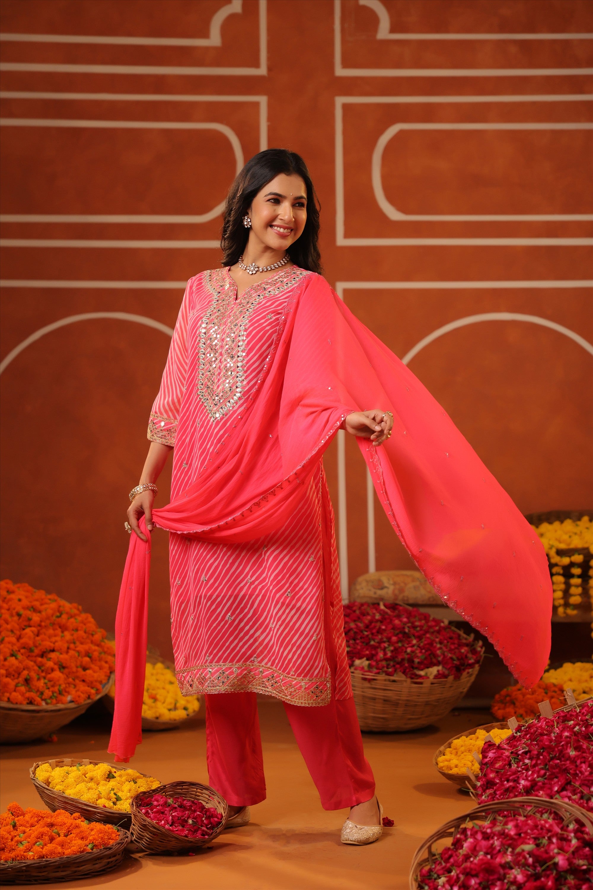 Coral Leheriya Georgette Embroidered Straight Suit Set