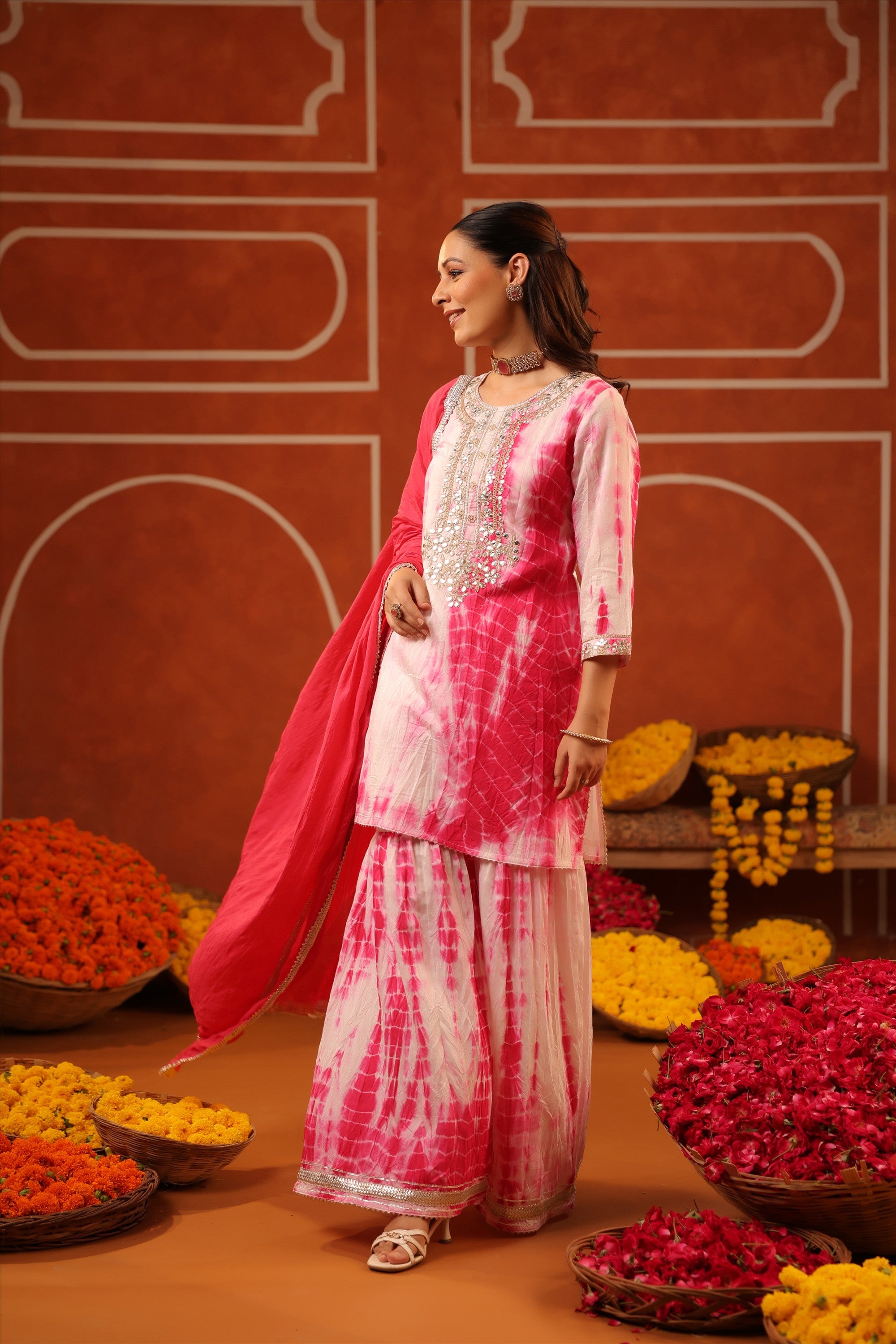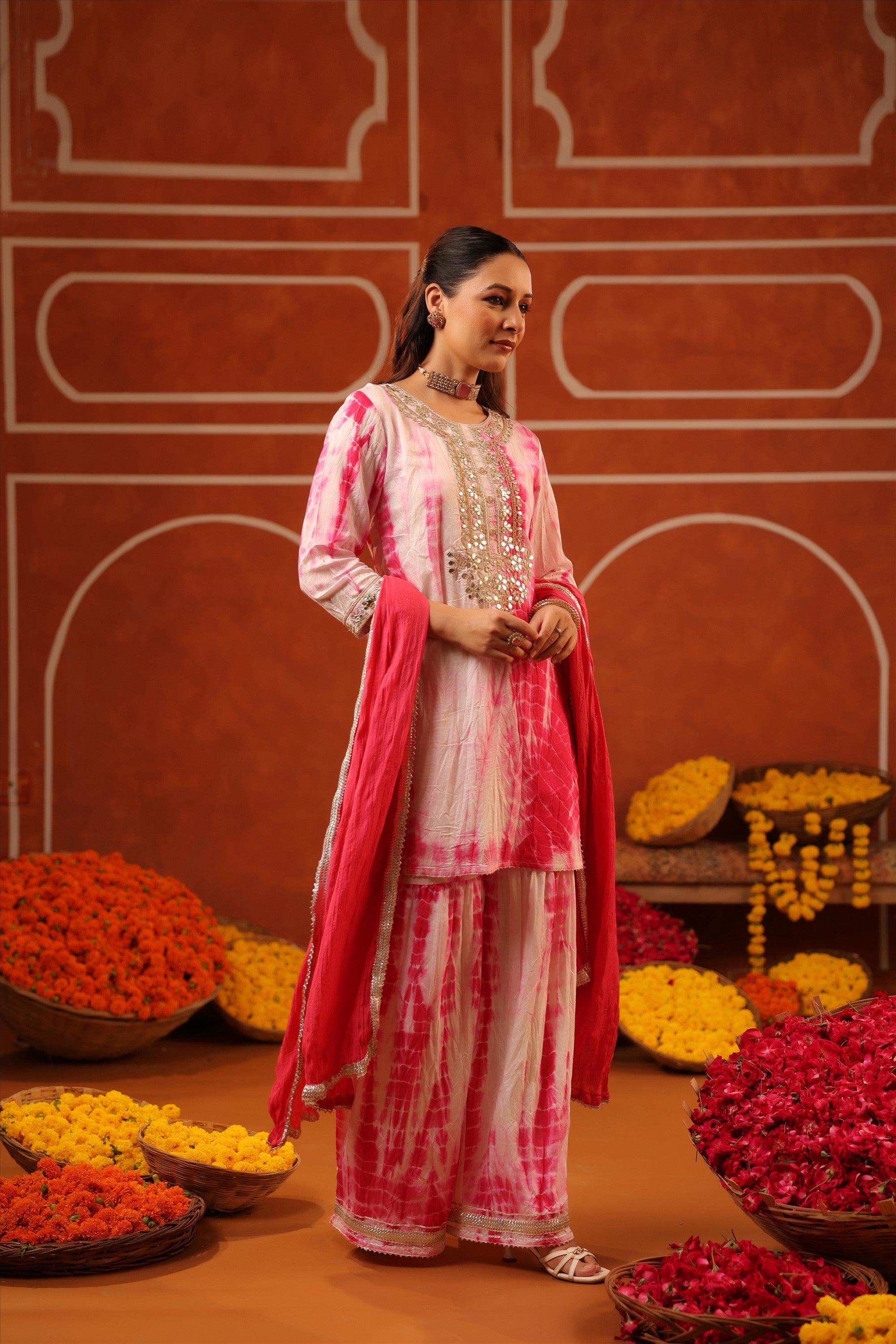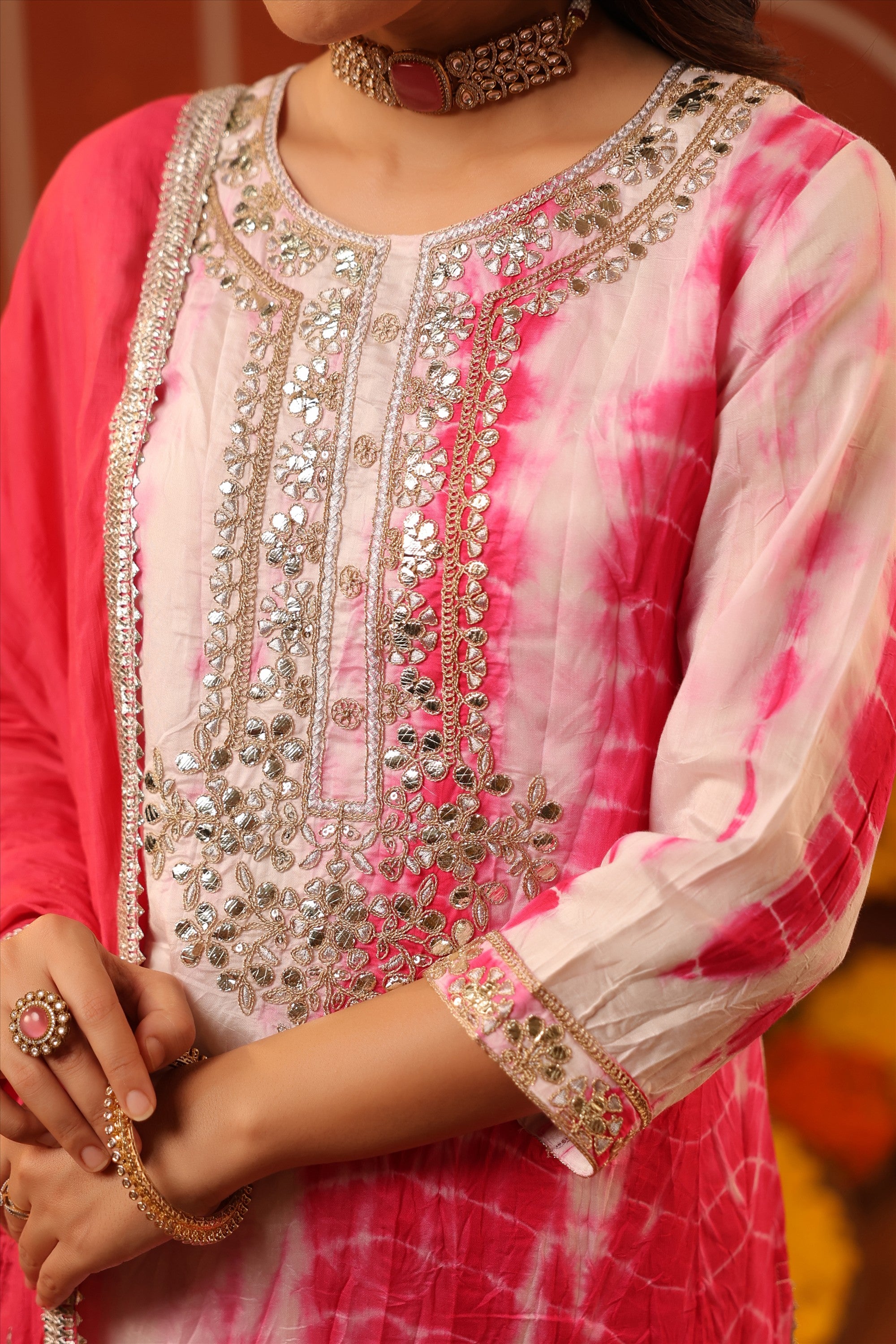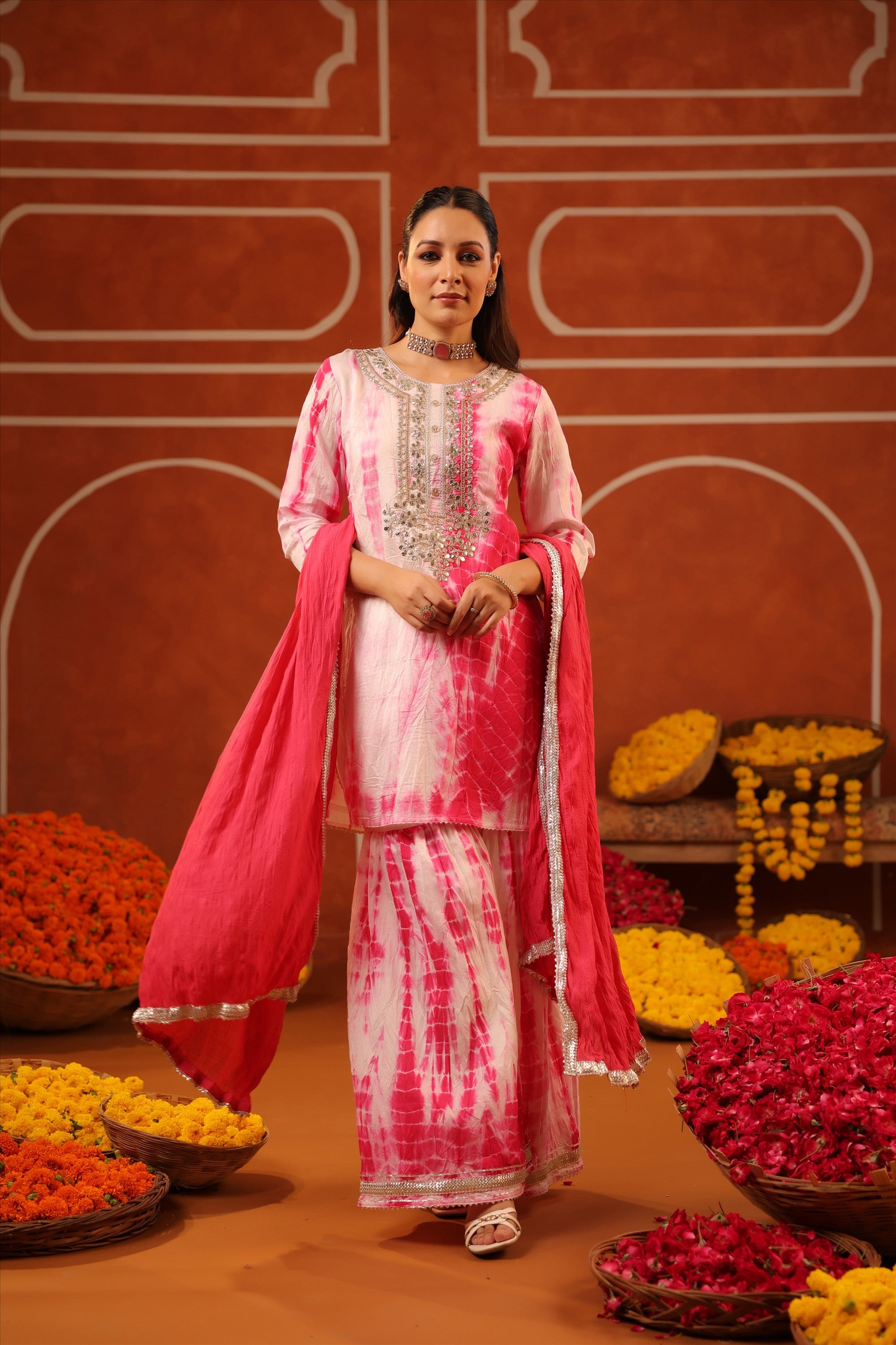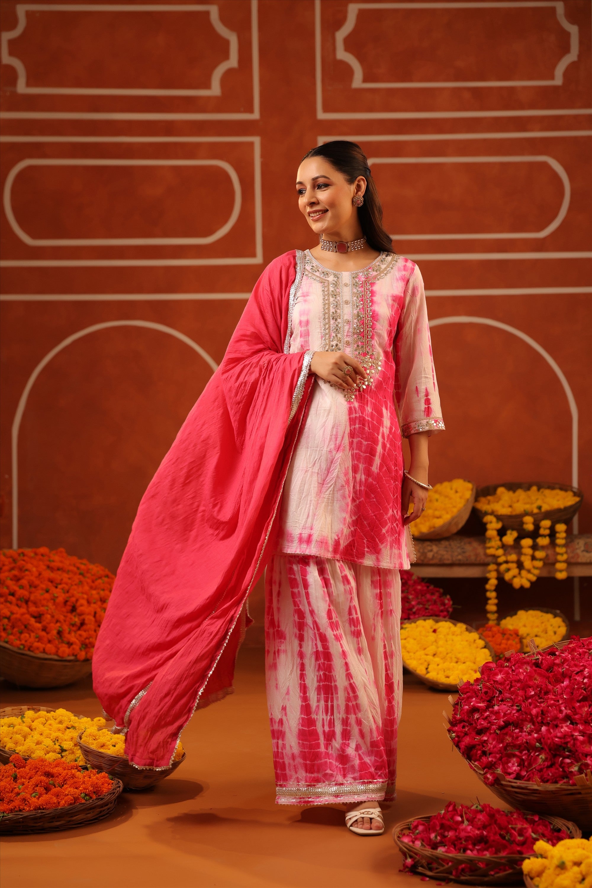 Elevate your everyday ethnic style with our Blue Cotton Cambric Block-Printed Embroidered Straight Suit Set. Crafted for all-day comfort and effortless charm, the kurta features a stylish V neckline, 3/4th sleeves, and a classic side-slitted straight silhouette, beautifully highlighted with intricate embroidery on the yoke. It’s paired with solid blue cambric pants and a block-printed mulmul dupatta, finished with bijia gota lace detailing that adds a festive sparkle. A graceful and versatile pick for summer festivities, daytime celebrations, and intimate gatherings.