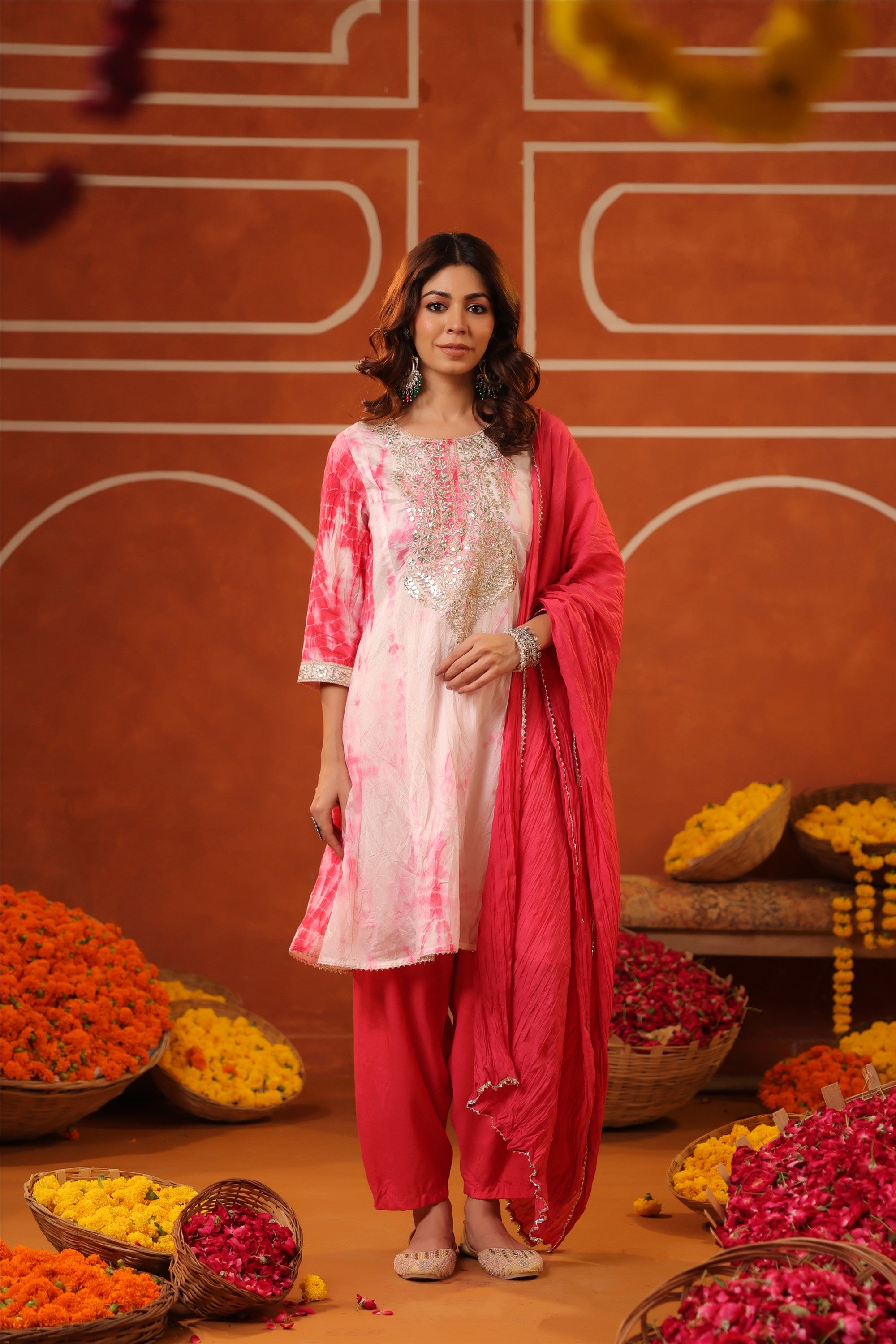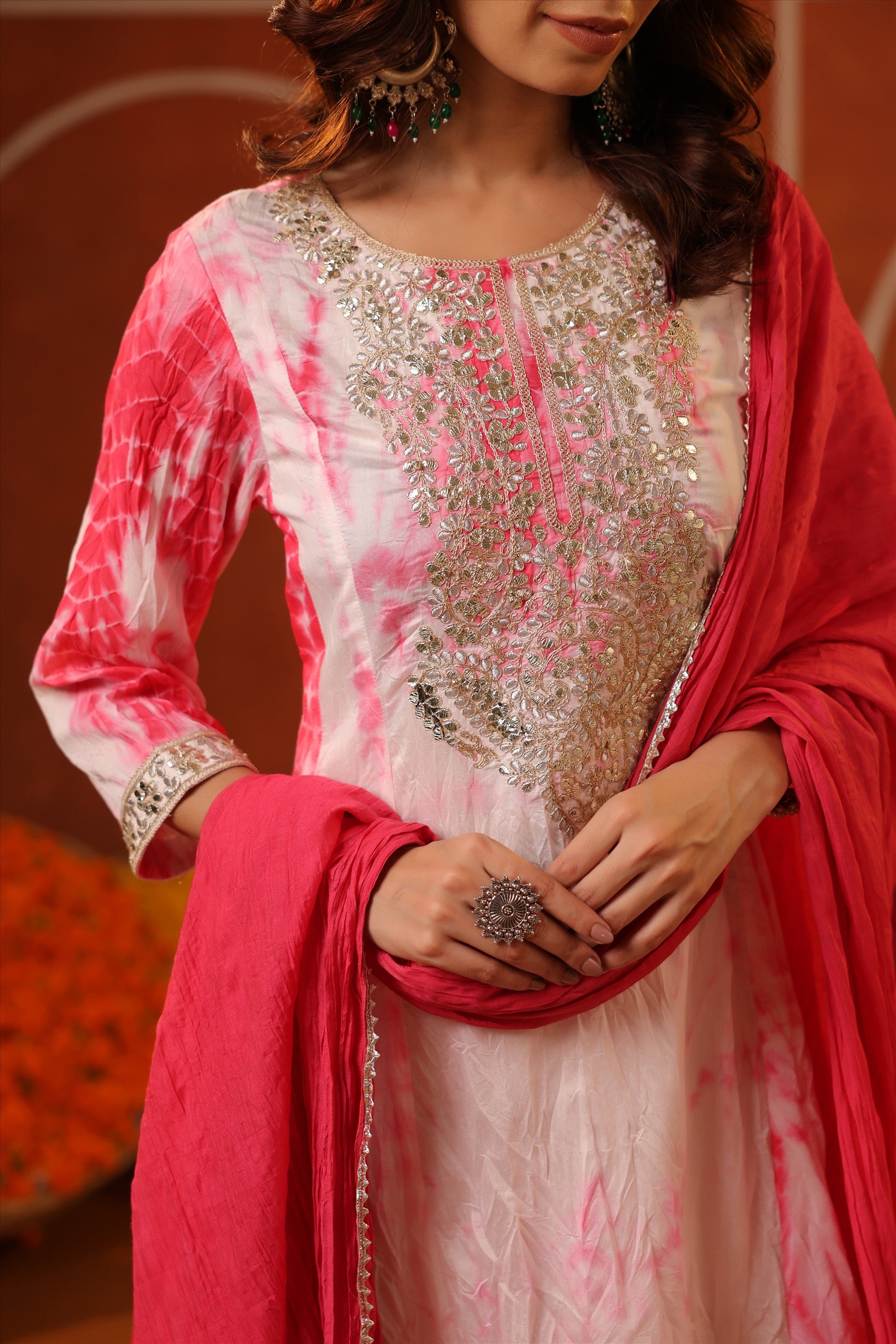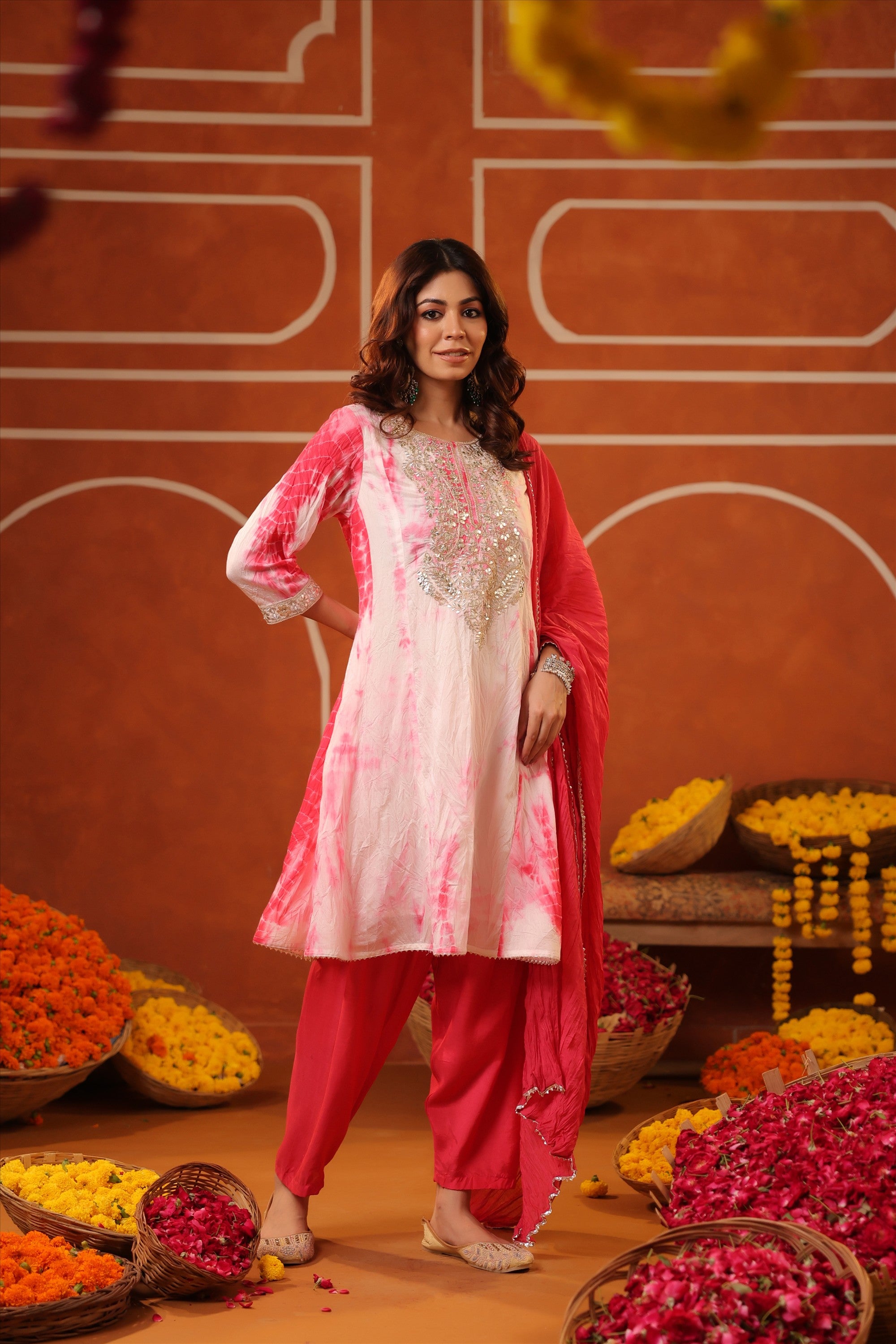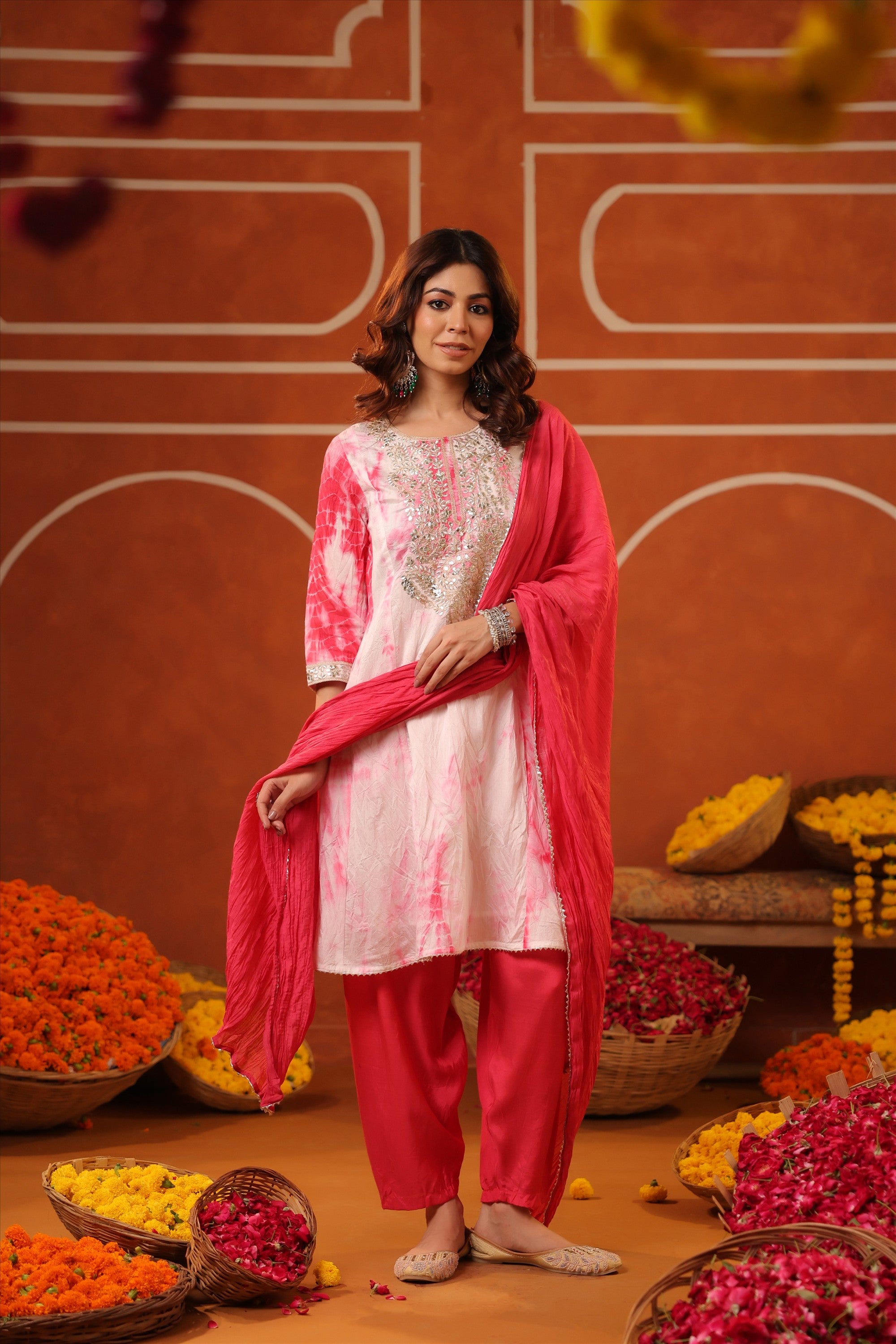 Elevate your everyday ethnic style with our Pink Cotton Cambric Block-Printed Embroidered Straight Suit Set. Crafted for all-day comfort and effortless charm, the kurta features a stylish V neckline, 3/4th sleeves, and a classic side-slitted straight silhouette, beautifully highlighted with intricate embroidery on the yoke. It’s paired with solid pink cambric pants and a block-printed mulmul dupatta, finished with bijia gota lace detailing that adds a festive sparkle. A graceful and versatile pick for summer festivities, daytime celebrations, and intimate gatherings.