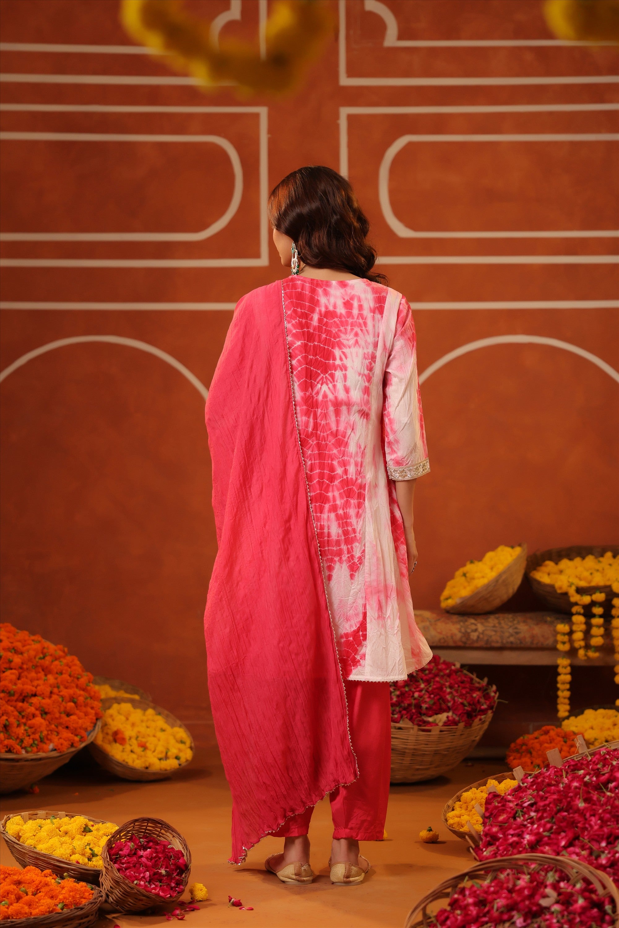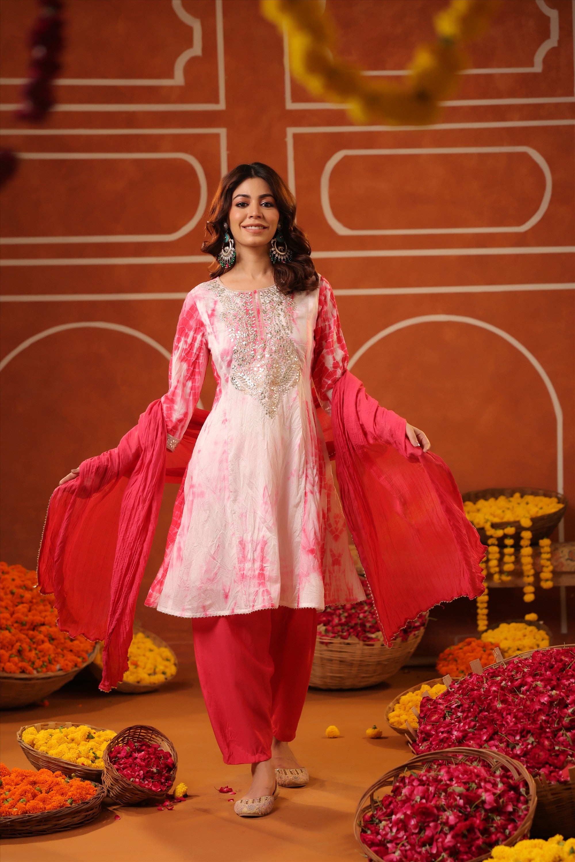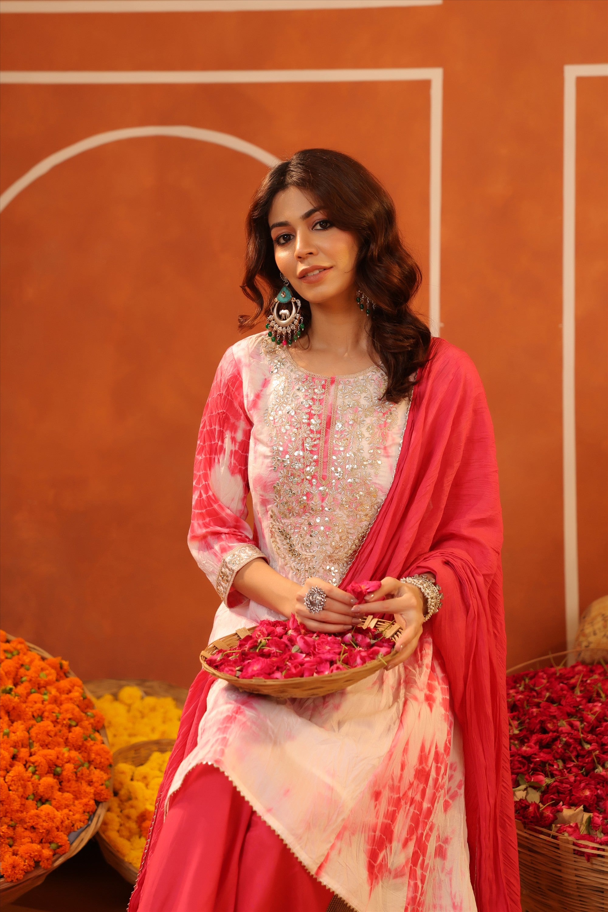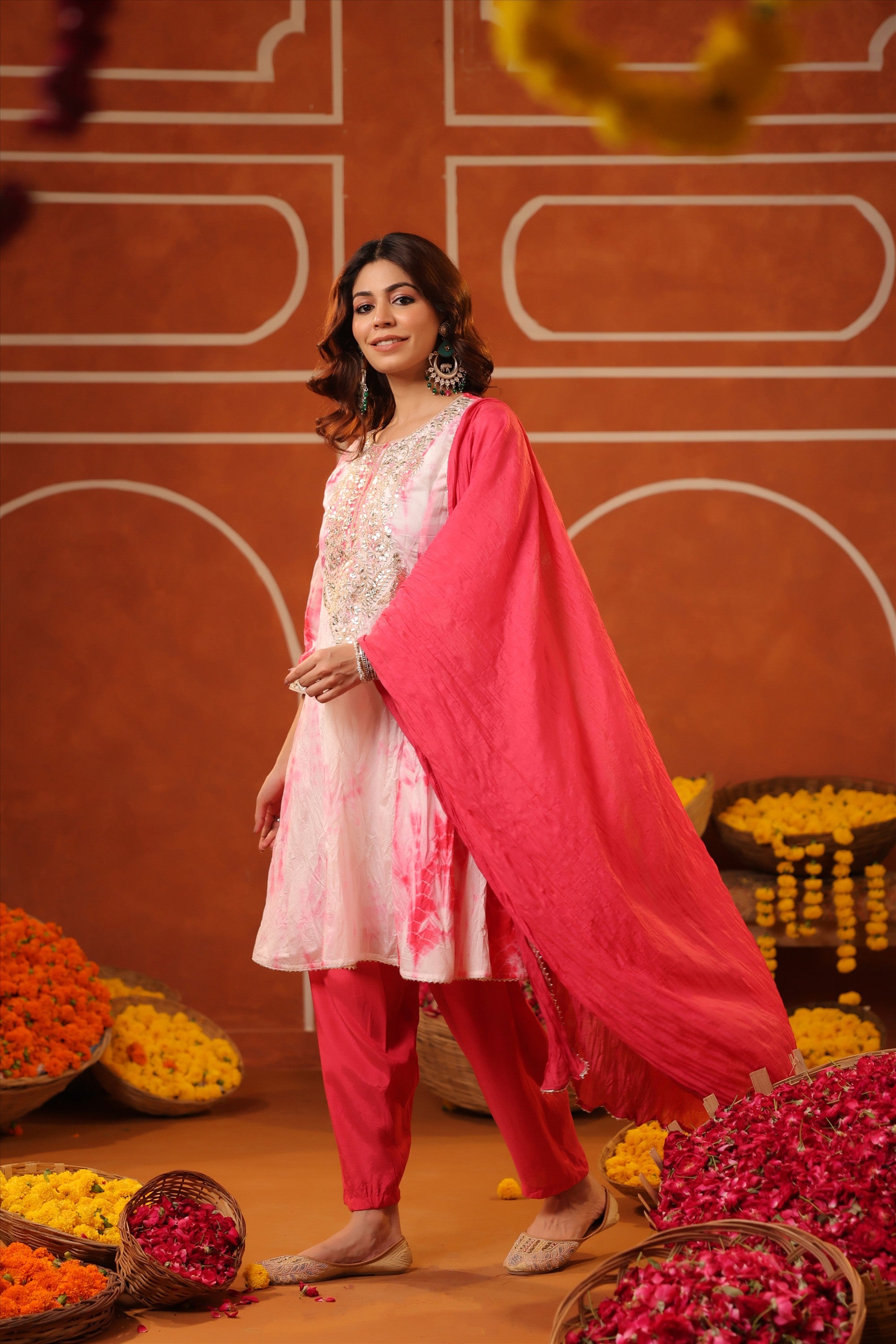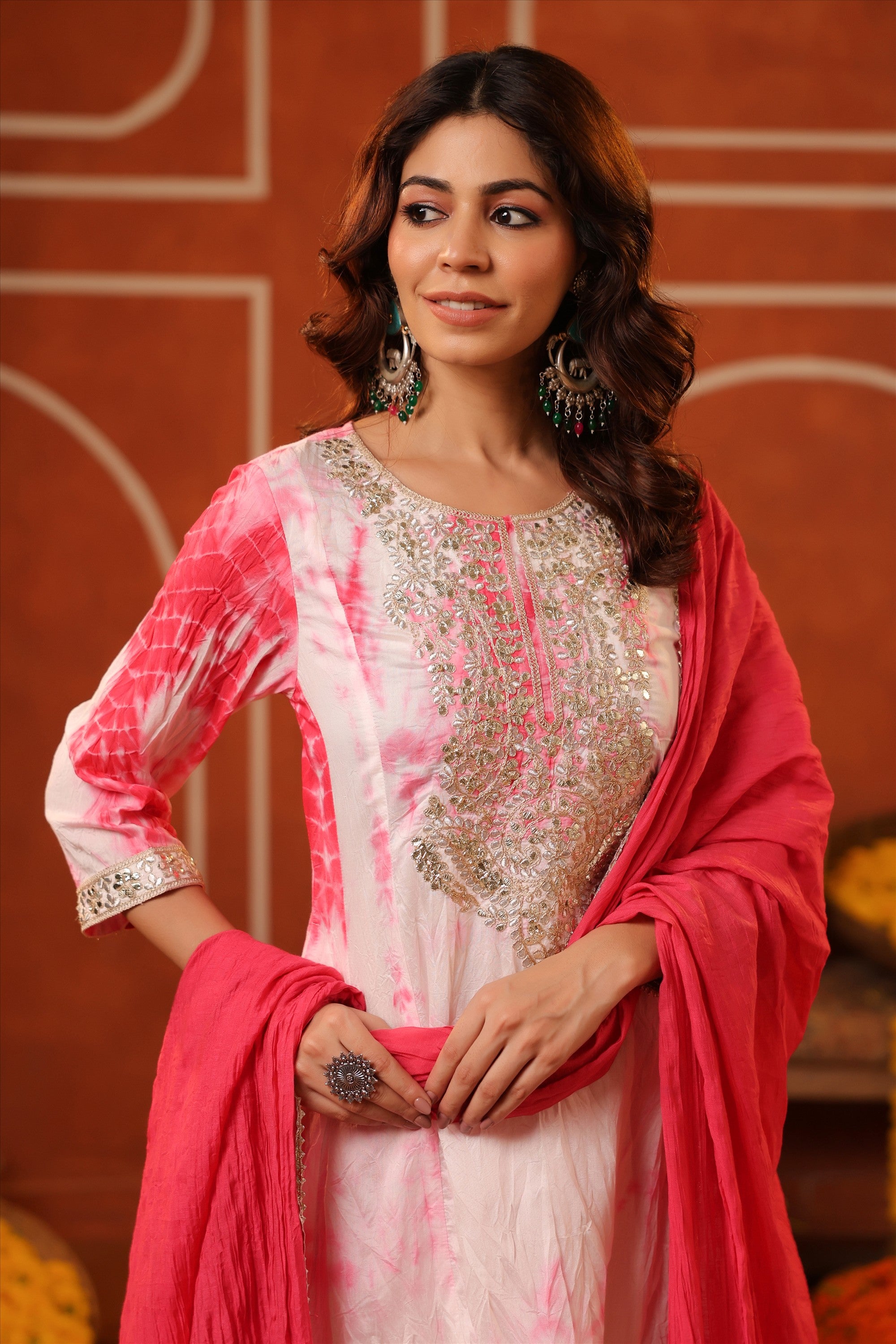 Elevate your everyday ethnic style with our Pink Cotton Cambric Block-Printed Embroidered Straight Suit Set. Crafted for all-day comfort and effortless charm, the kurta features a stylish V neckline, 3/4th sleeves, and a classic side-slitted straight silhouette, beautifully highlighted with intricate embroidery on the yoke. It’s paired with solid pink cambric pants and a block-printed mulmul dupatta, finished with bijia gota lace detailing that adds a festive sparkle. A graceful and versatile pick for summer festivities, daytime celebrations, and intimate gatherings.