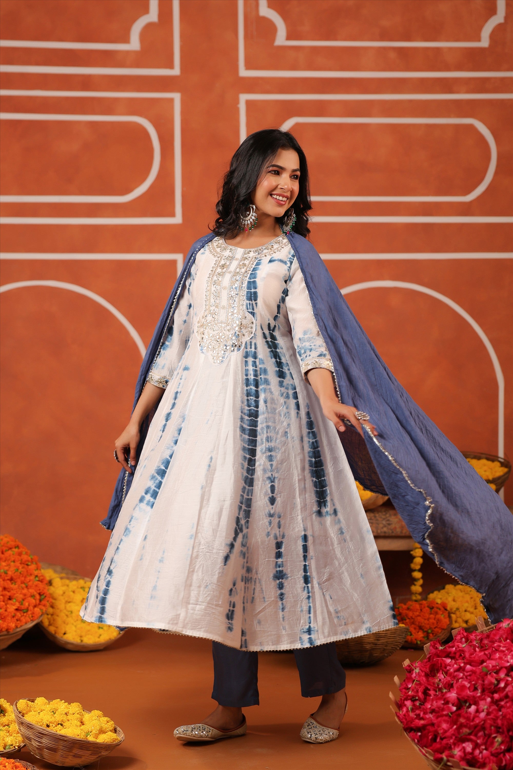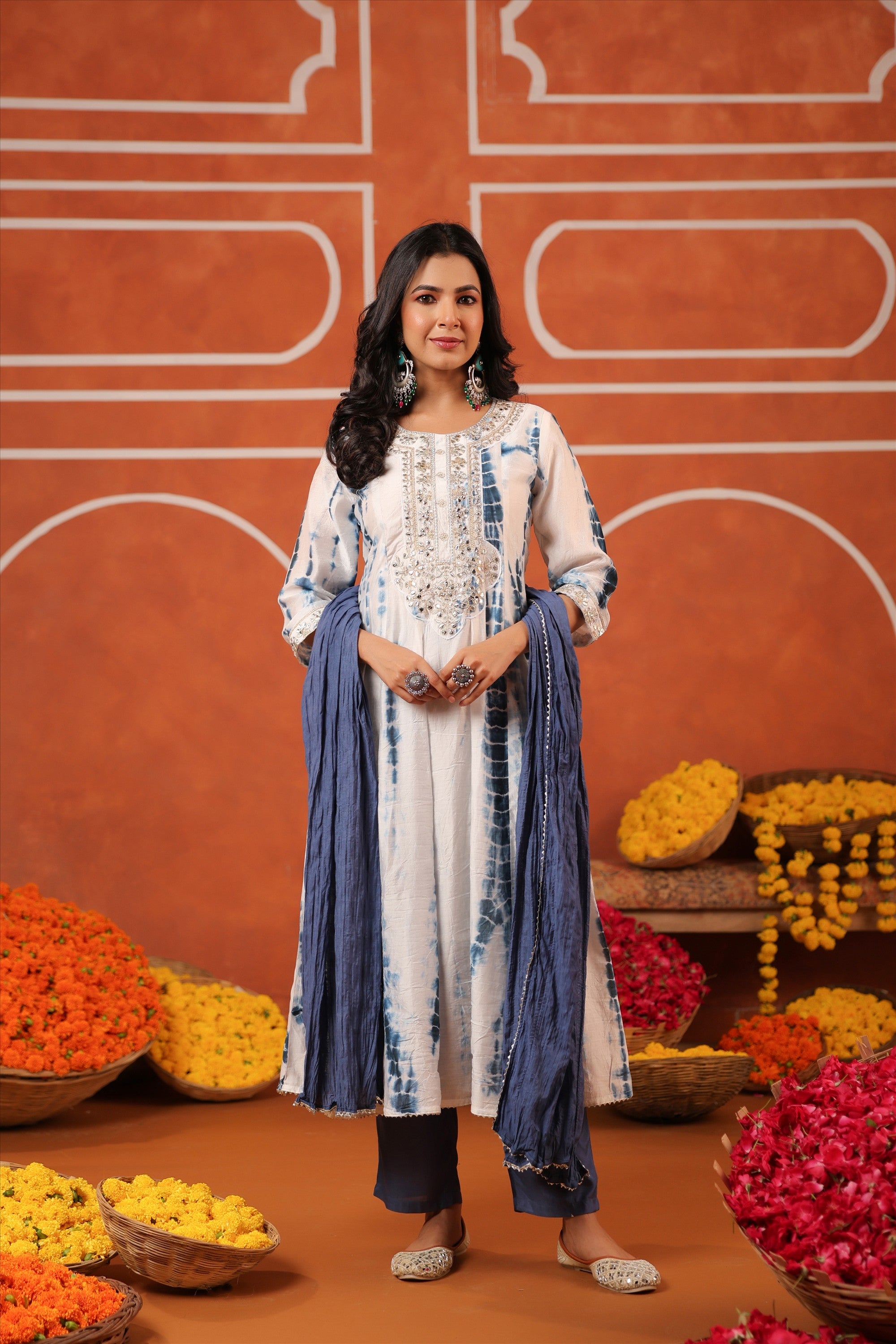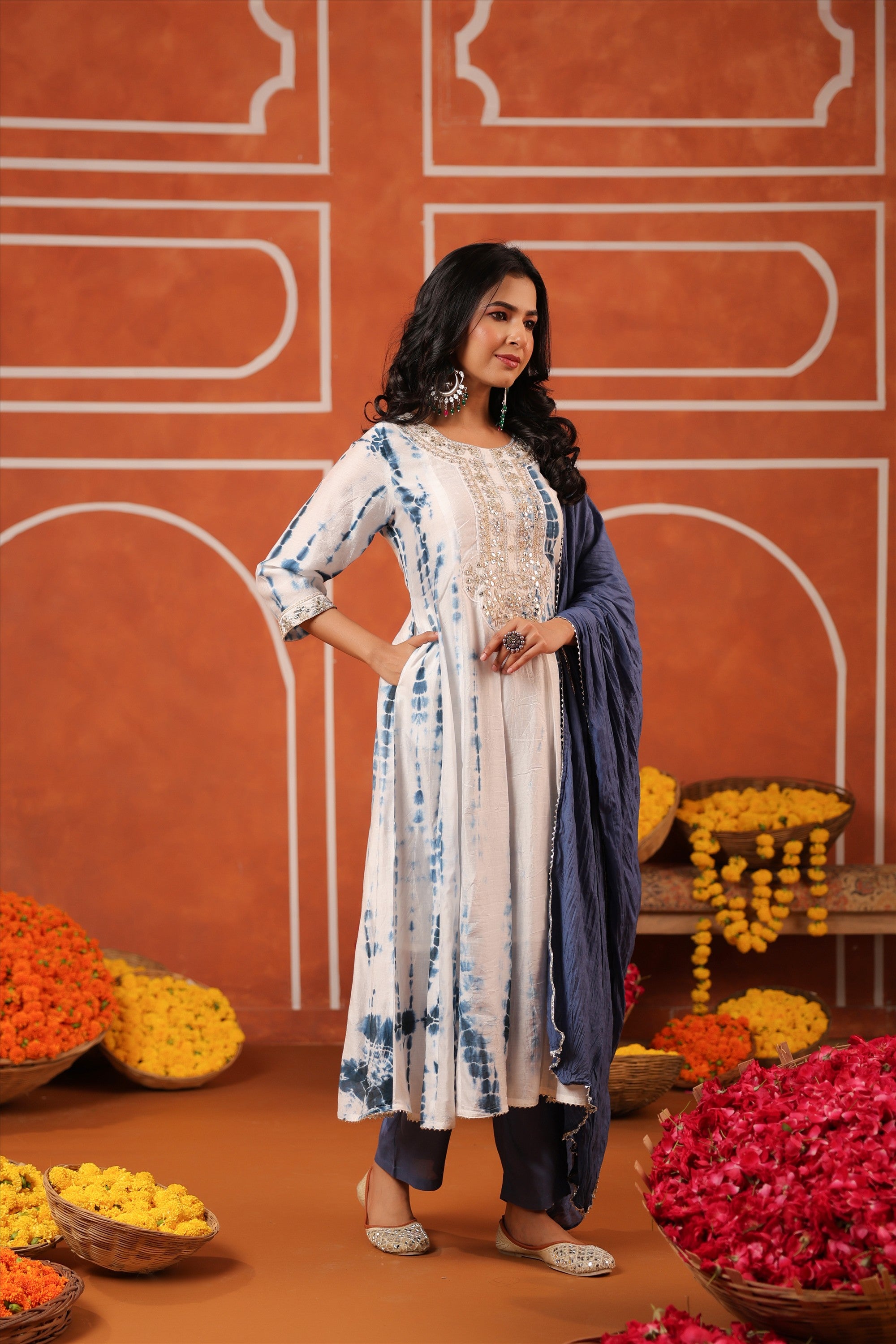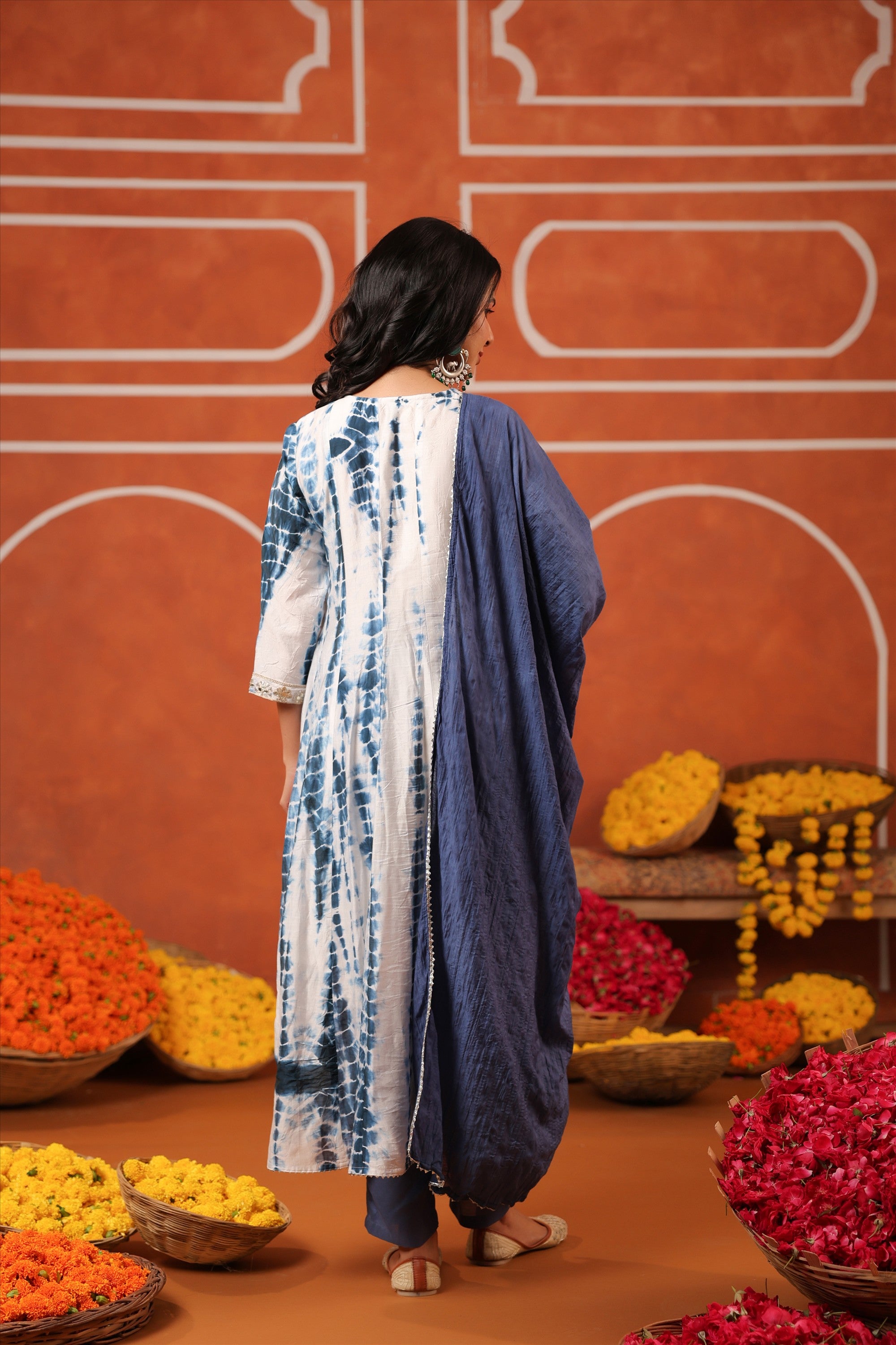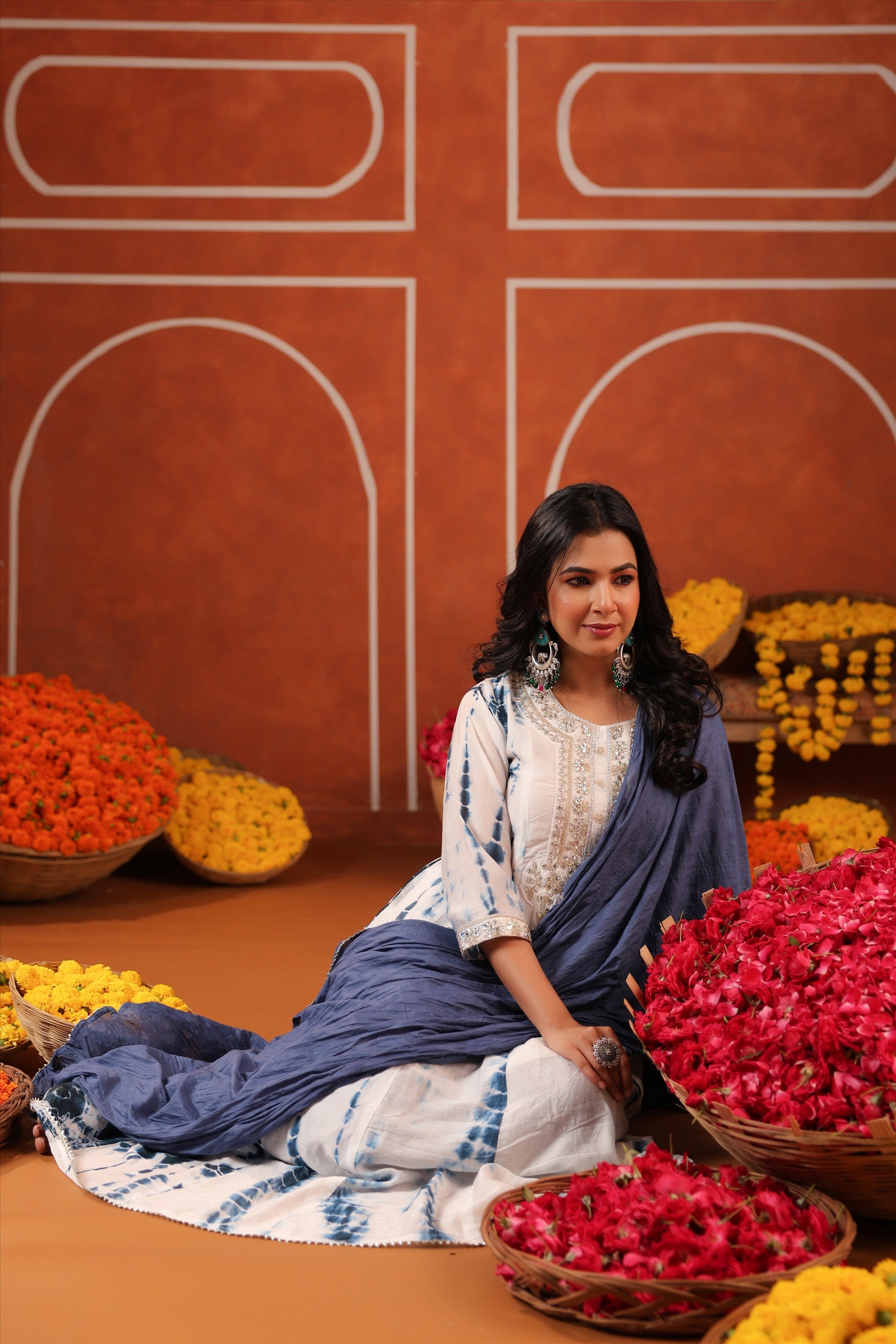 Elevate your ethnic wardrobe with this effortlessly elegant three-piece set in soft lavender cotton mulmul. The shrug features exquisite Khari printing, delicate sequin work on the yoke, and intricate gota detailing on the yoke and sleeve borders. Designed with a gathered empire waist and front-tie strings adorned with fabric tassels, it adds a graceful flair to your look. Layered over a spaghetti-strapped, side-slit printed kurta and paired with solid matching cotton pants, this set brings together comfort, style, and sophistication—perfect for summer gatherings, daytime festivities, or casual celebrations.
