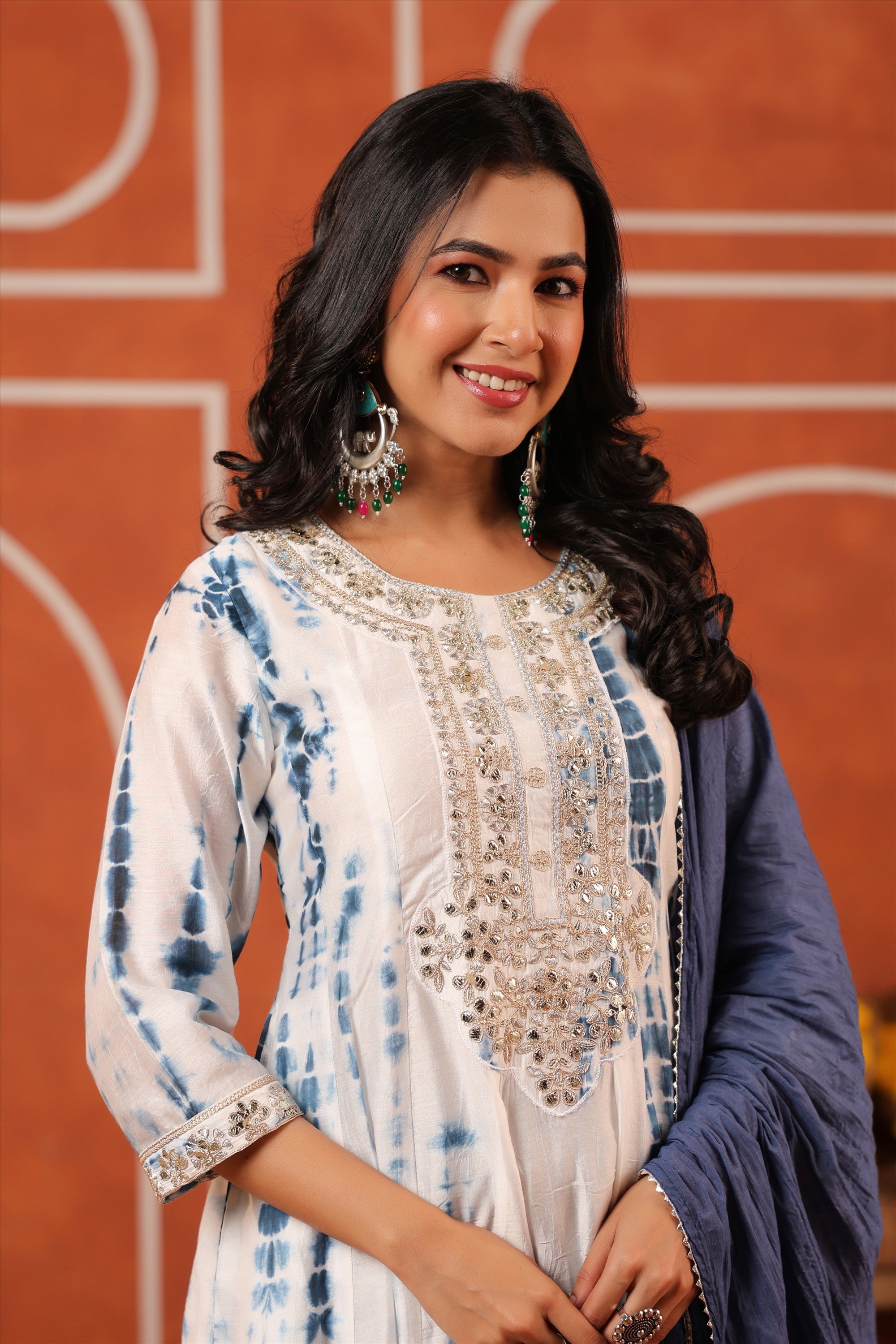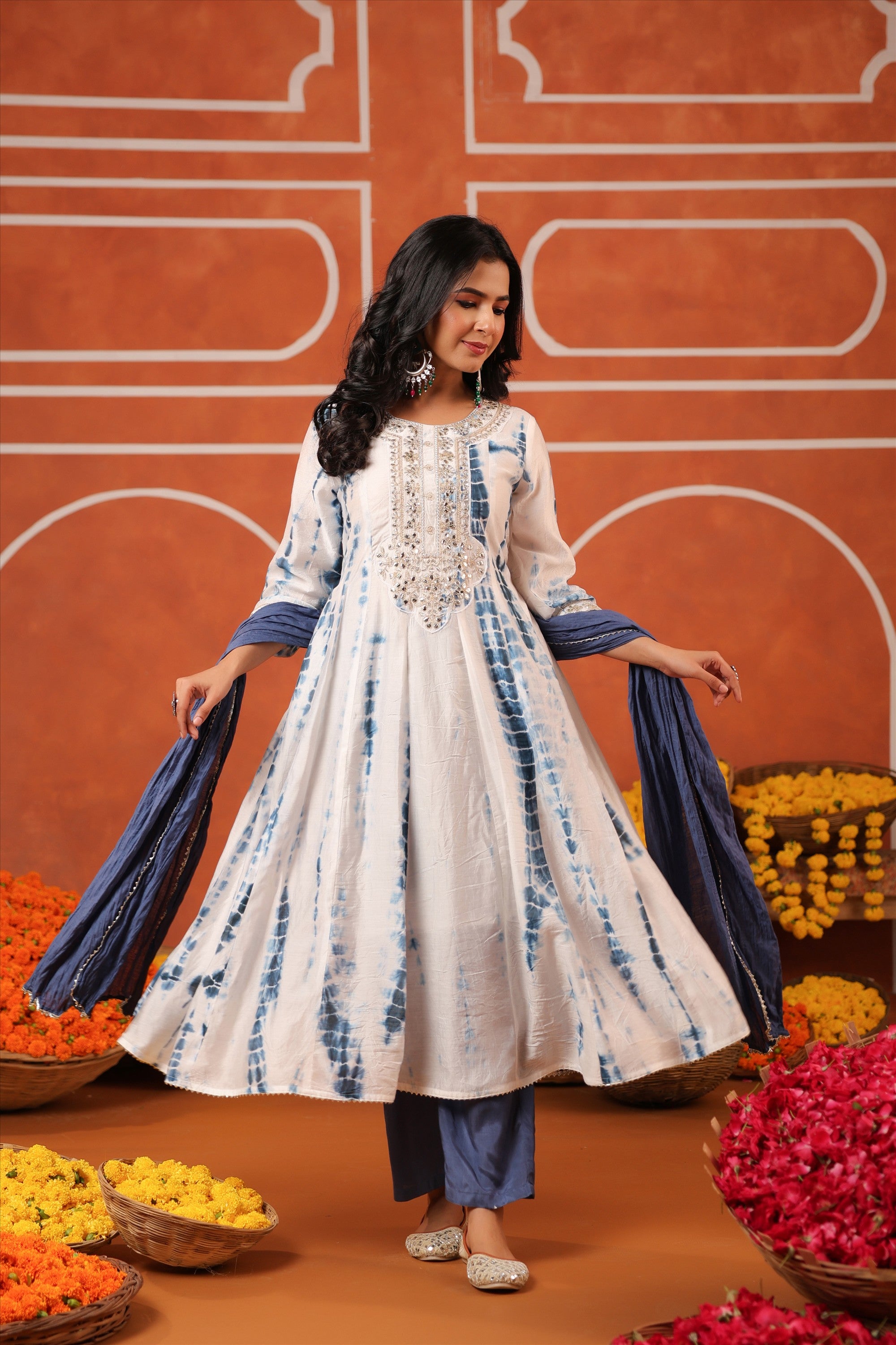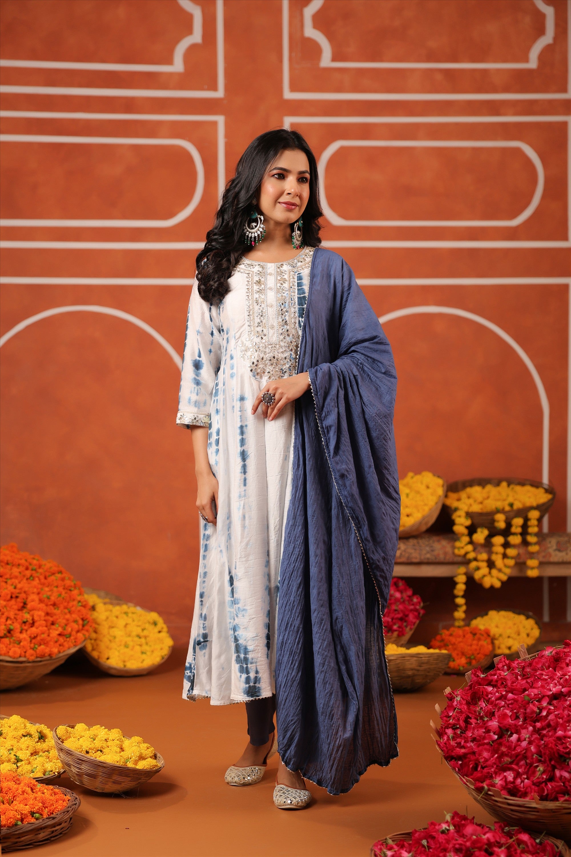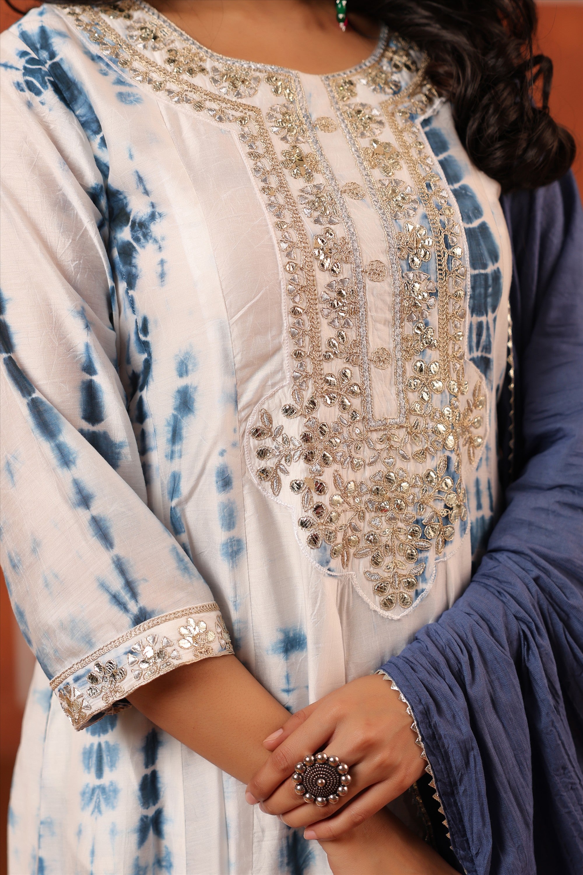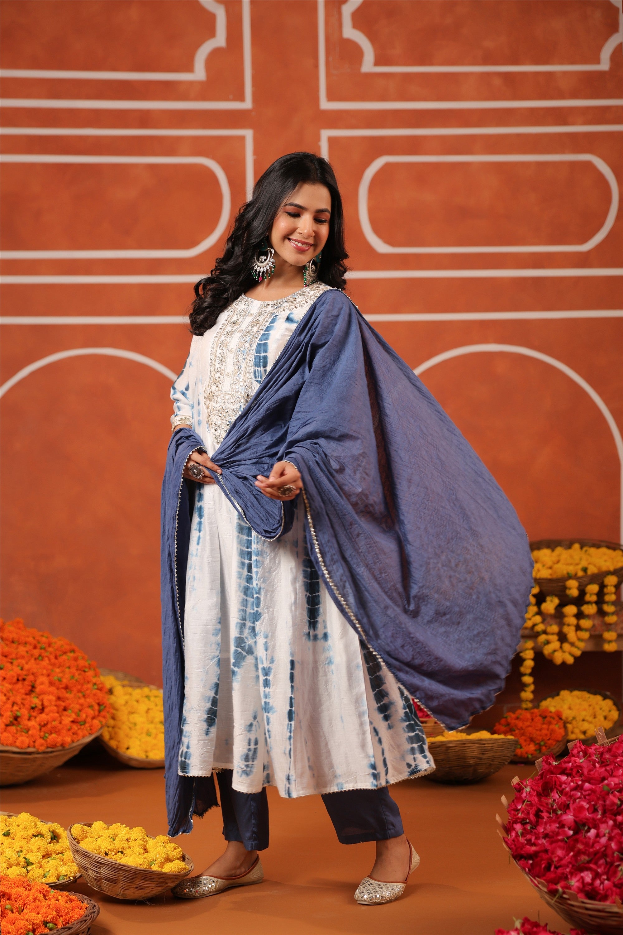 Elevate your ethnic wardrobe with this effortlessly elegant three-piece set in soft lavender cotton mulmul. The shrug features exquisite Khari printing, delicate sequin work on the yoke, and intricate gota detailing on the yoke and sleeve borders. Designed with a gathered empire waist and front-tie strings adorned with fabric tassels, it adds a graceful flair to your look. Layered over a spaghetti-strapped, side-slit printed kurta and paired with solid matching cotton pants, this set brings together comfort, style, and sophistication—perfect for summer gatherings, daytime festivities, or casual celebrations.