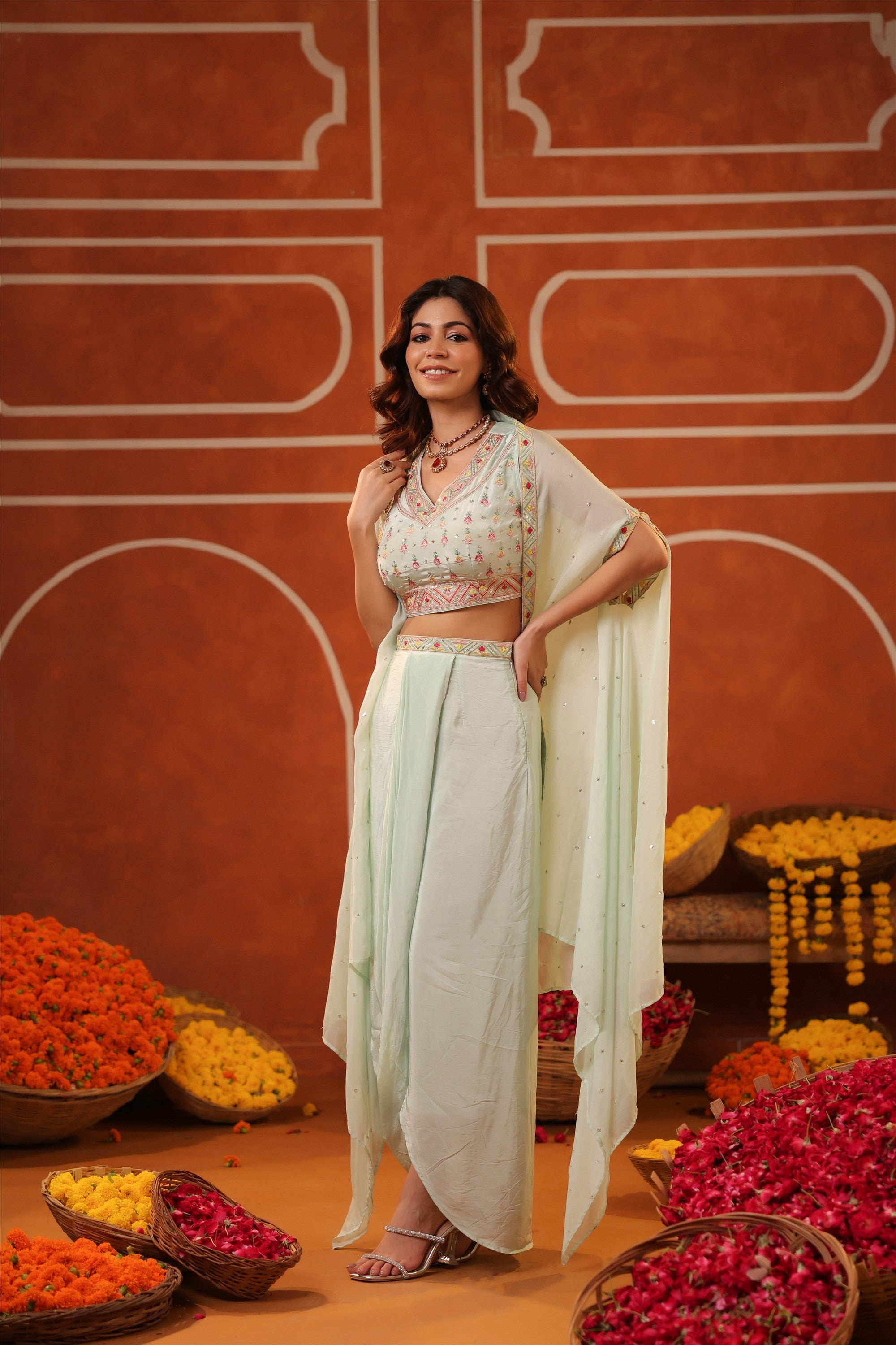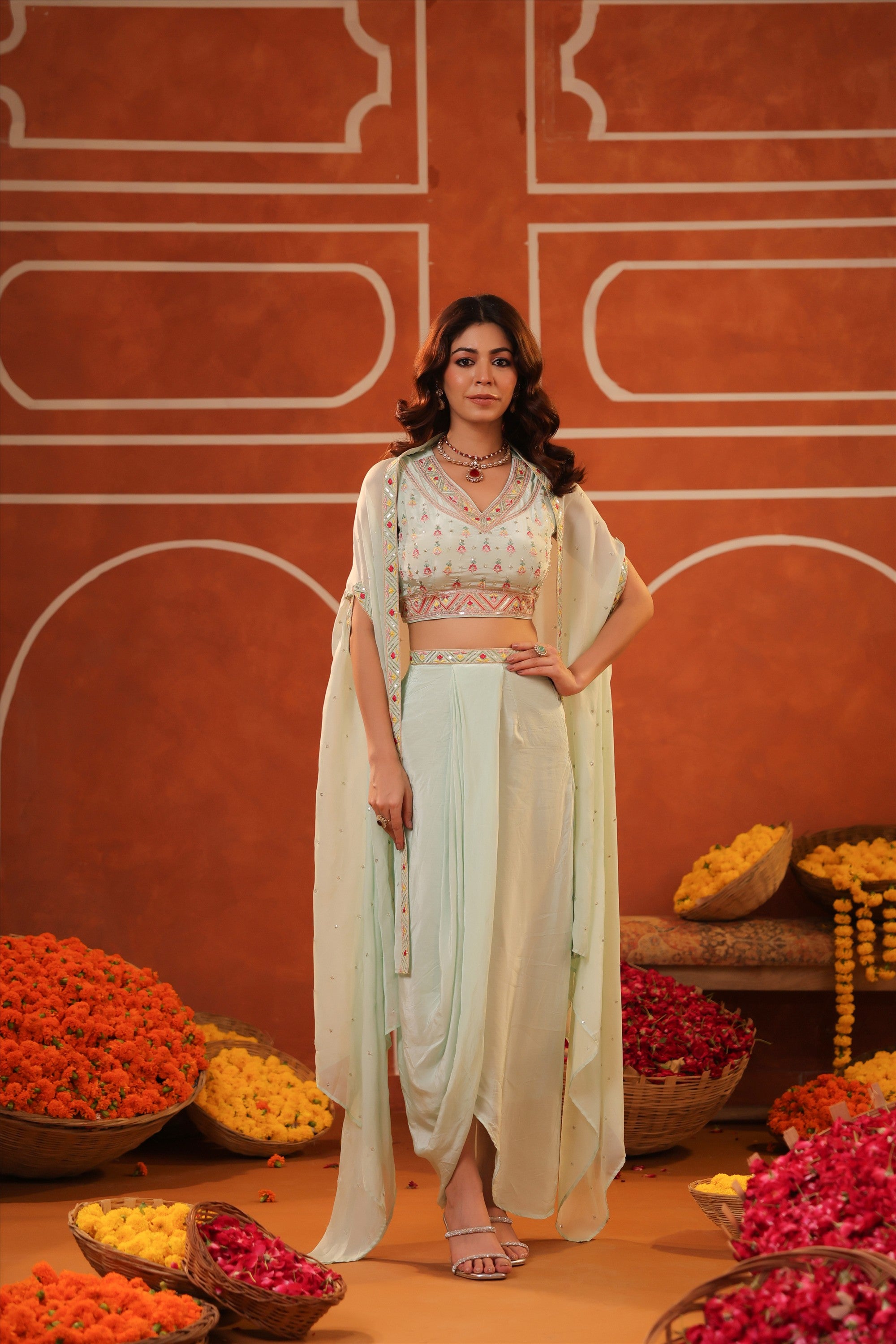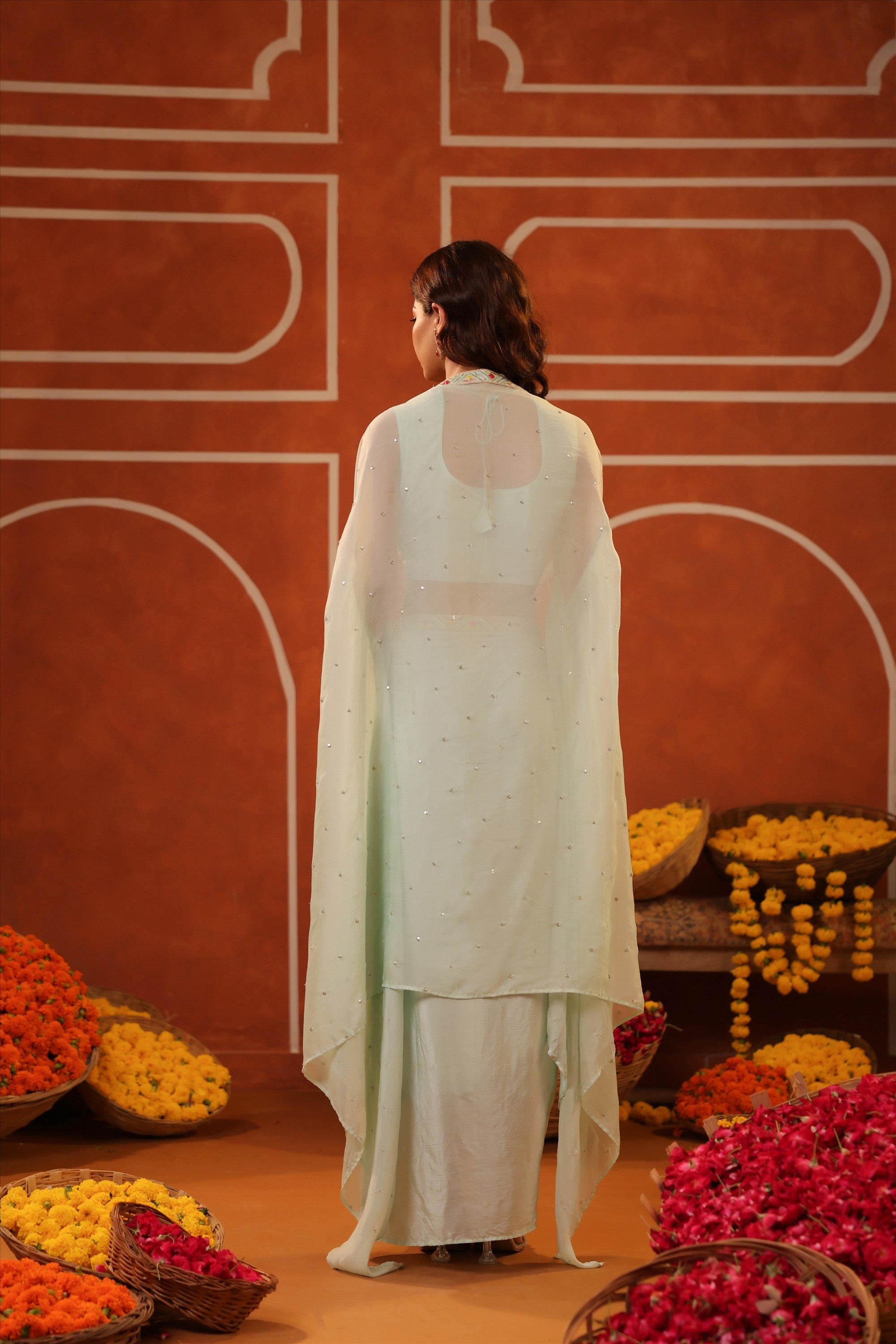 Mint Crepe Silk Embroidered Drape Skirt Set With Cape