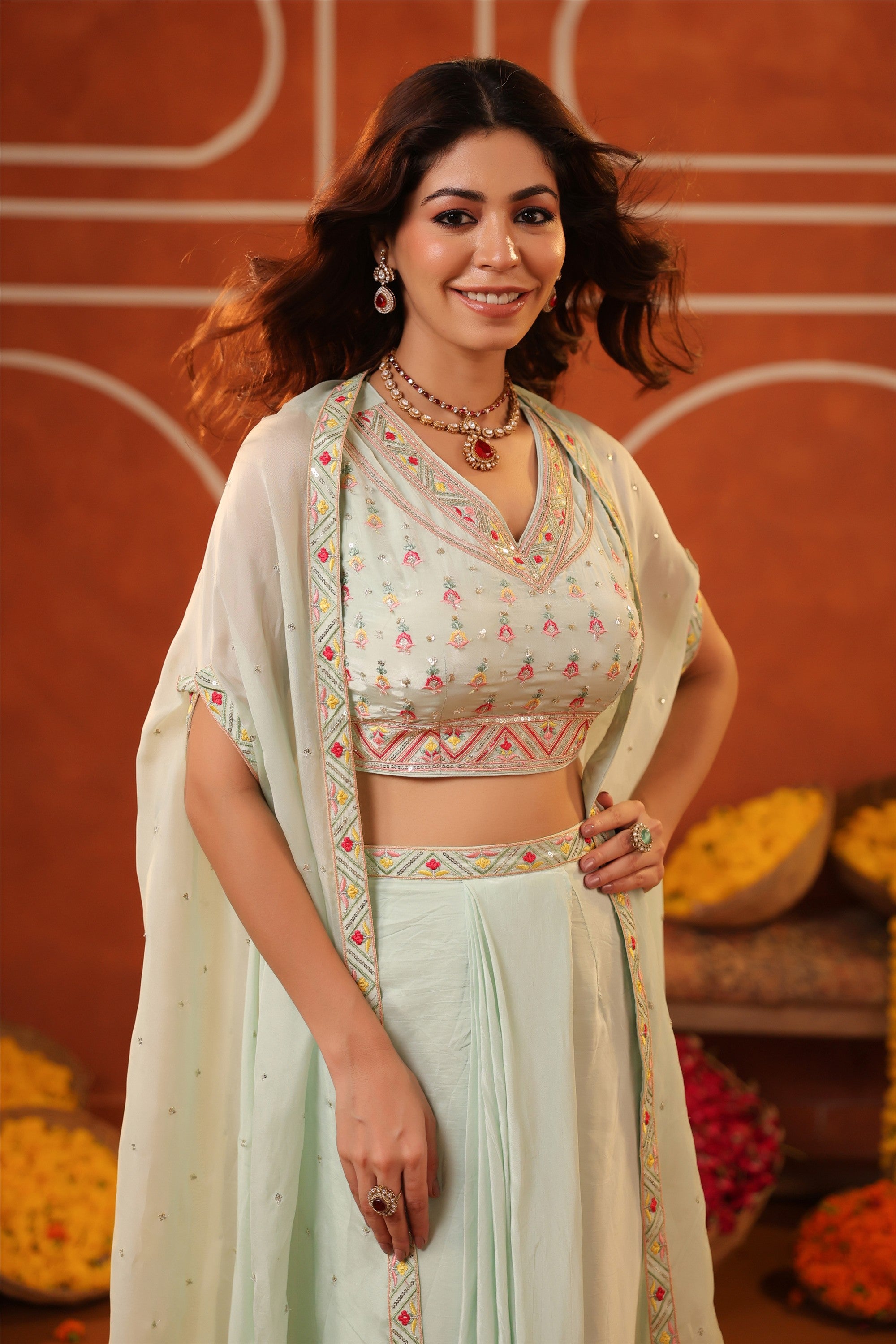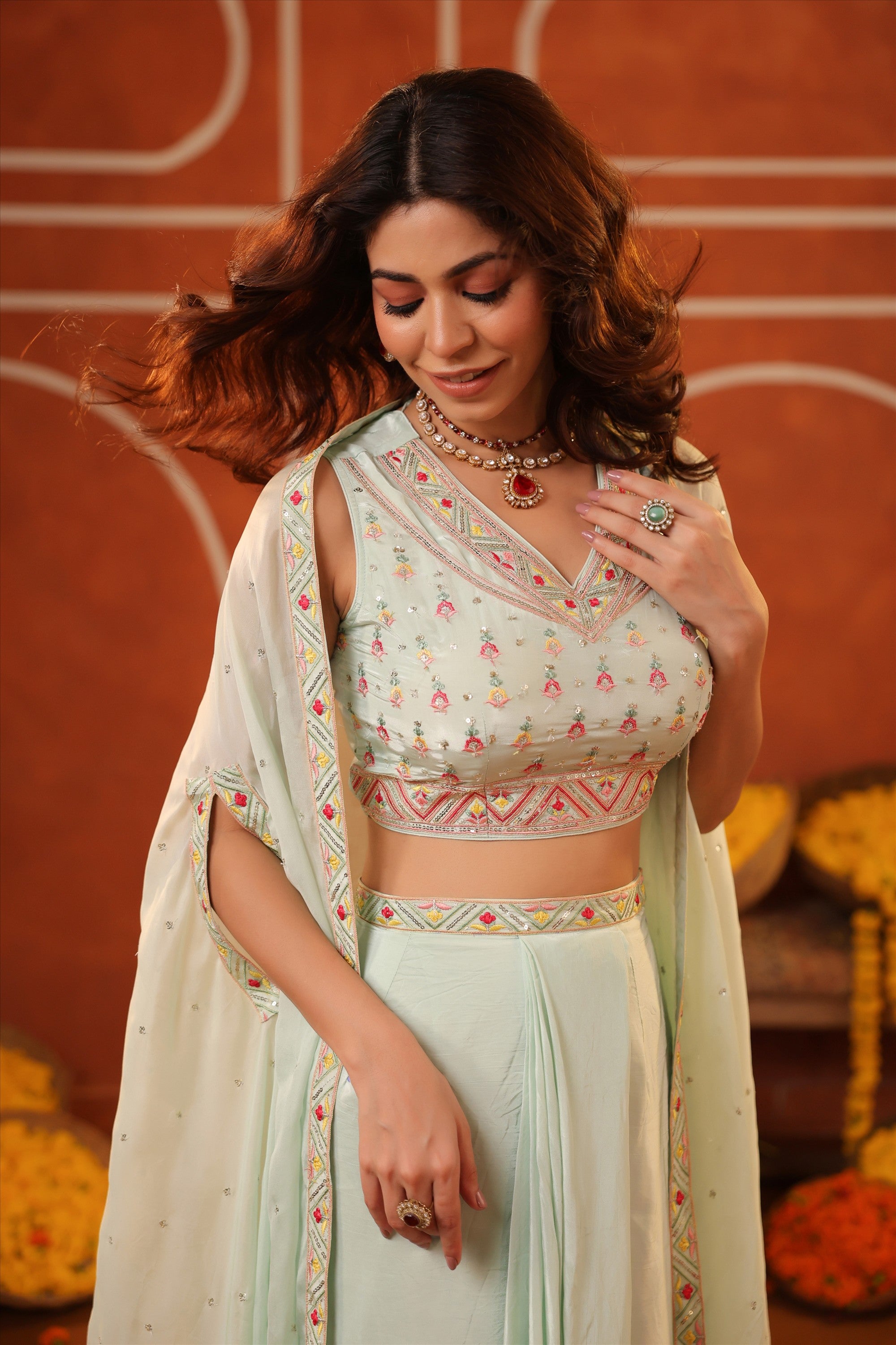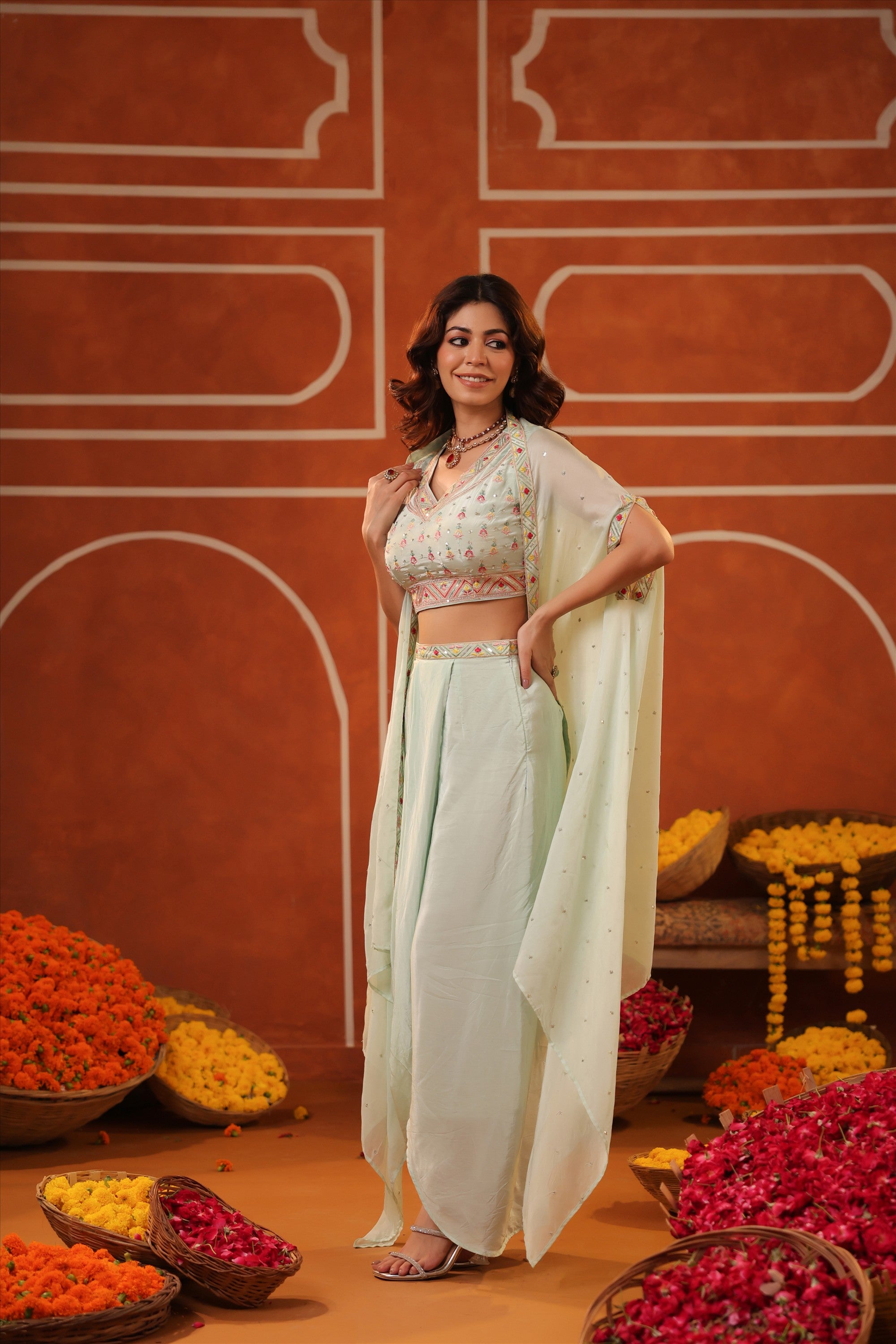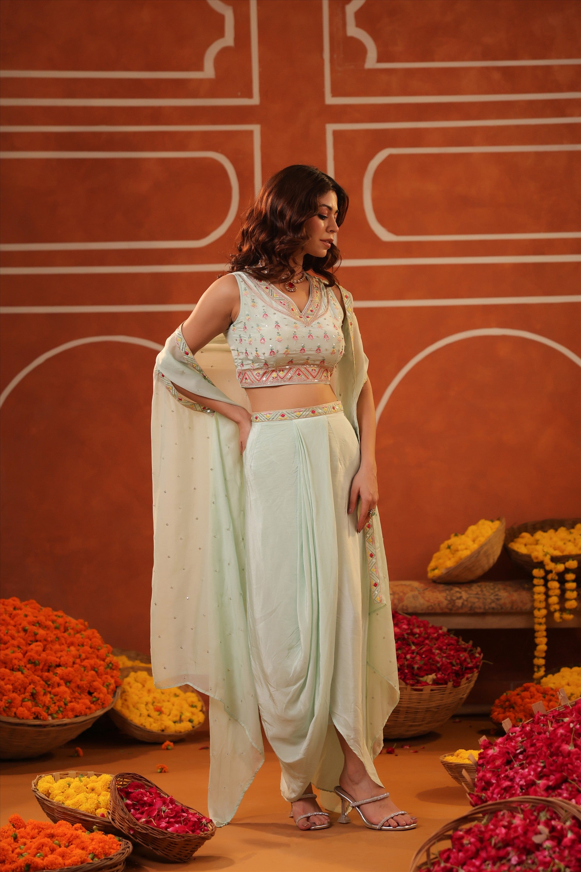 Mint Crepe Silk Embroidered Drape Skirt Set With Cape