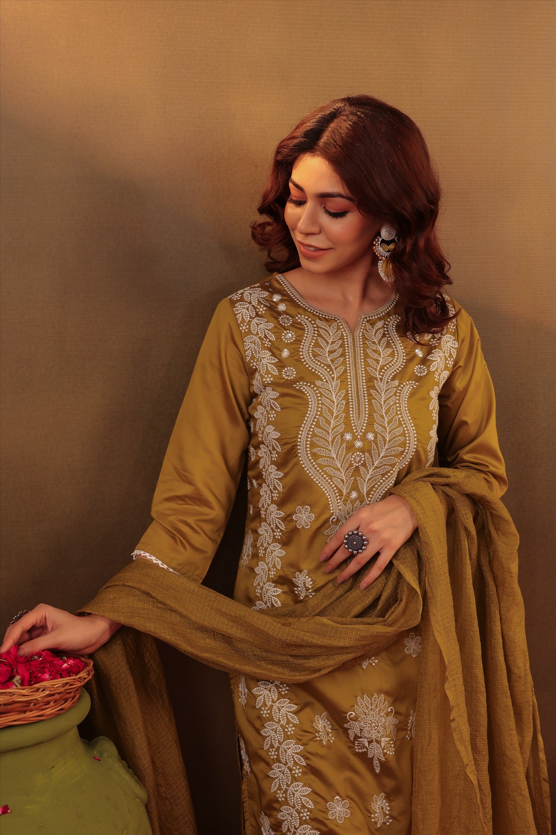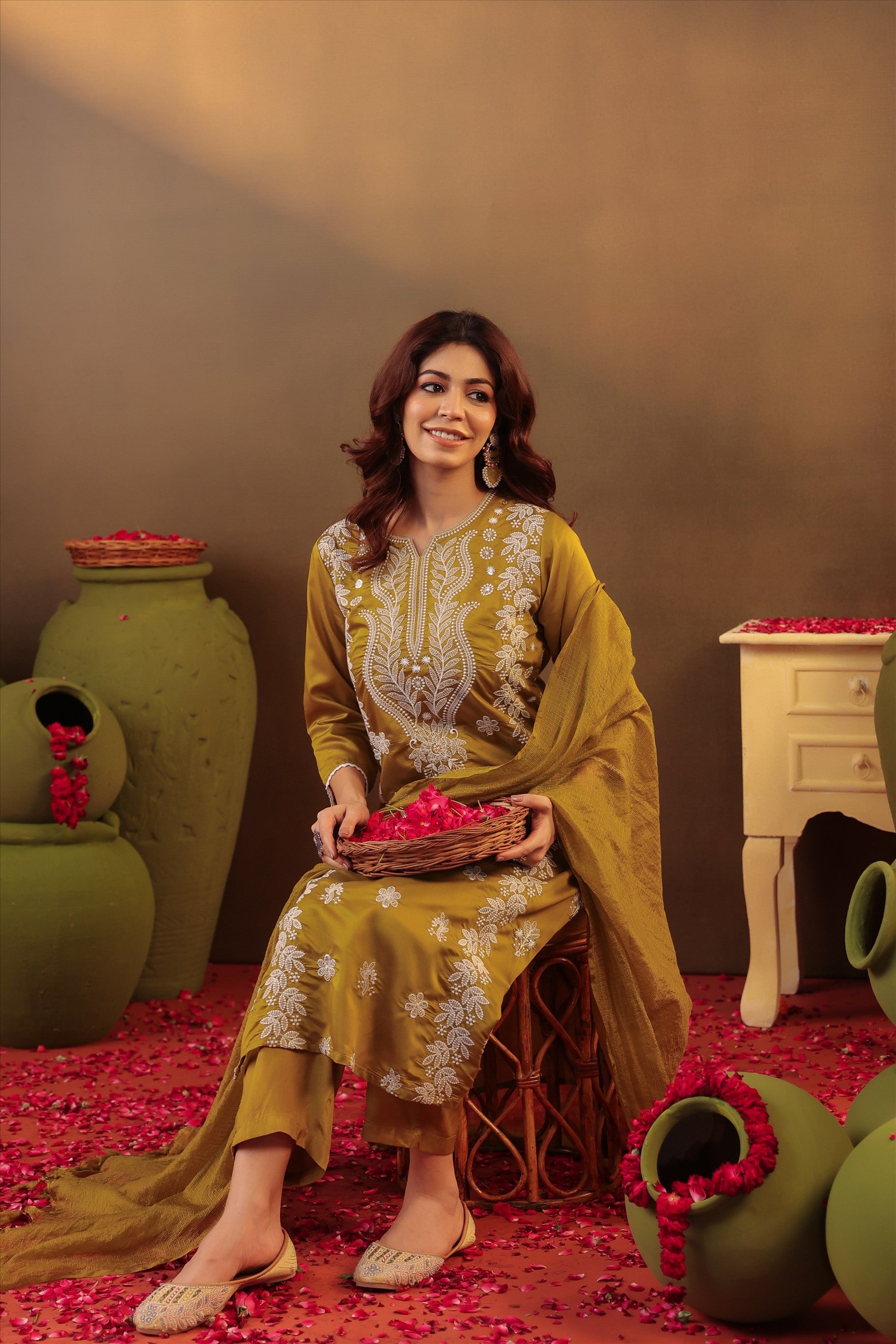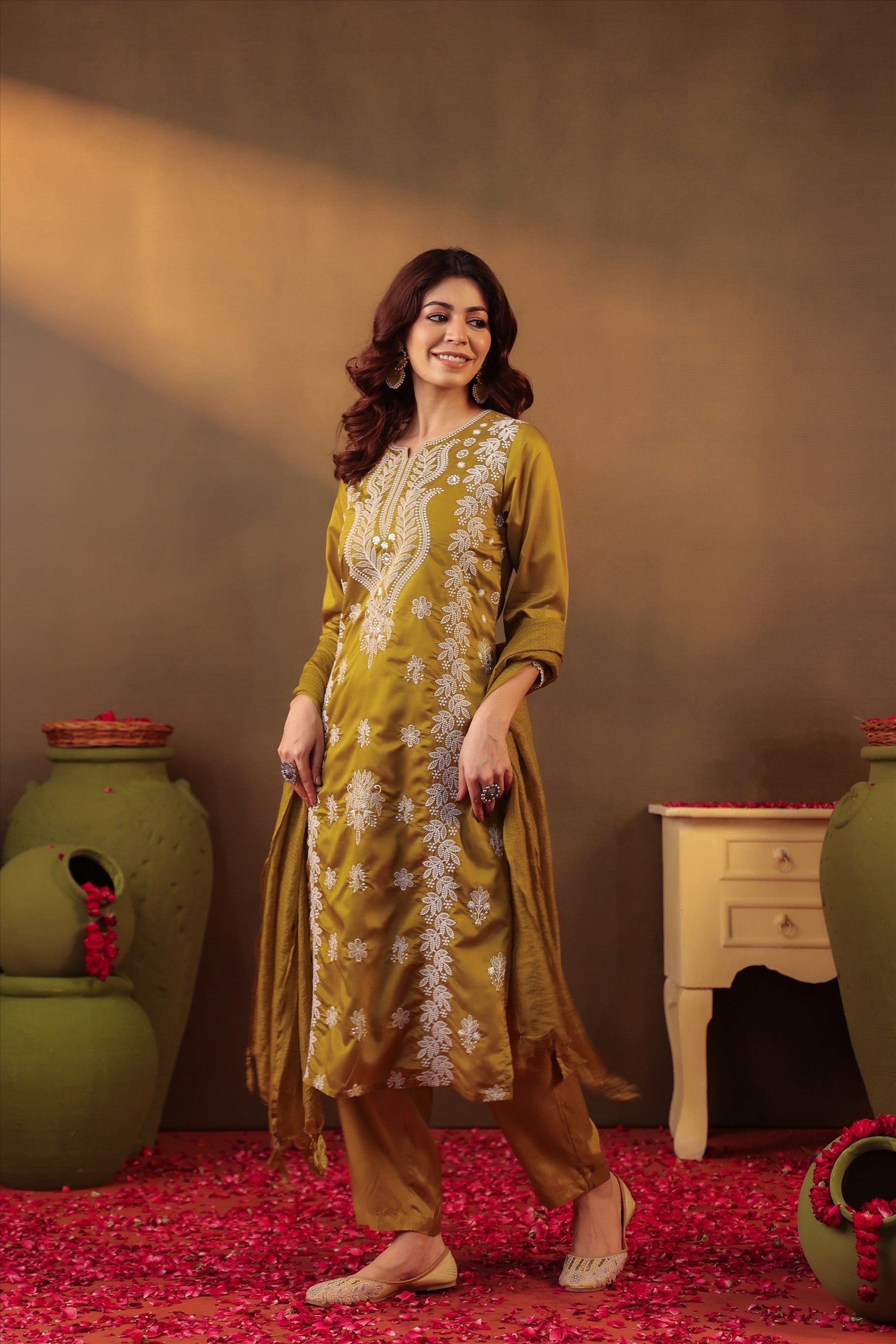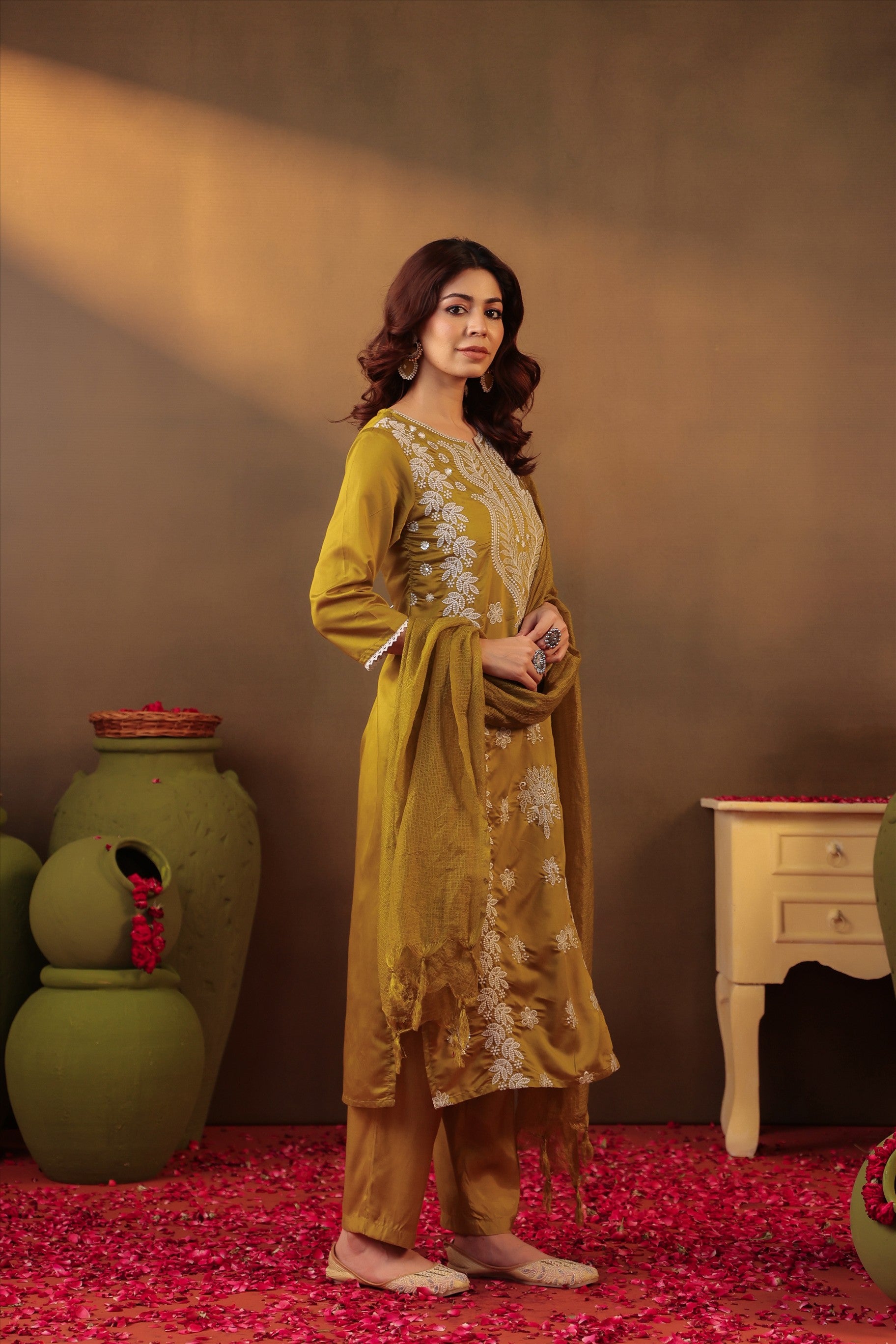 Olive Chanderi Silk Chikankari Embroidered Straight Suit Set