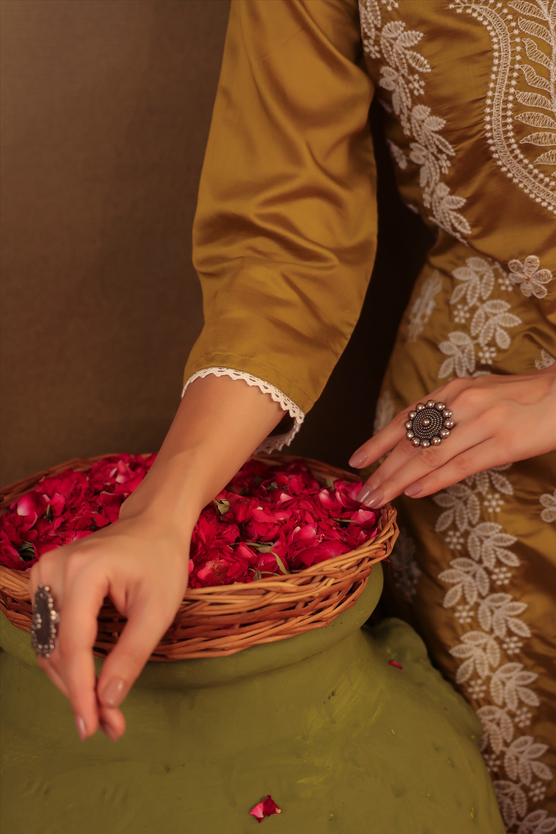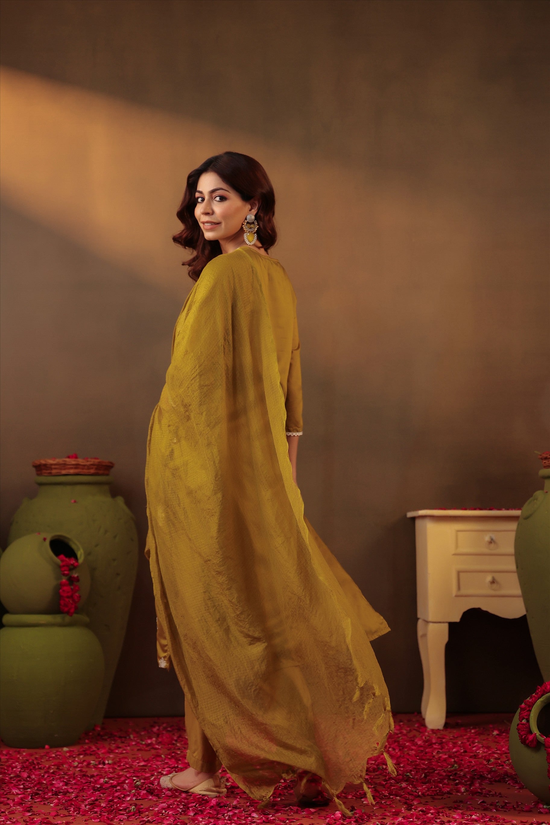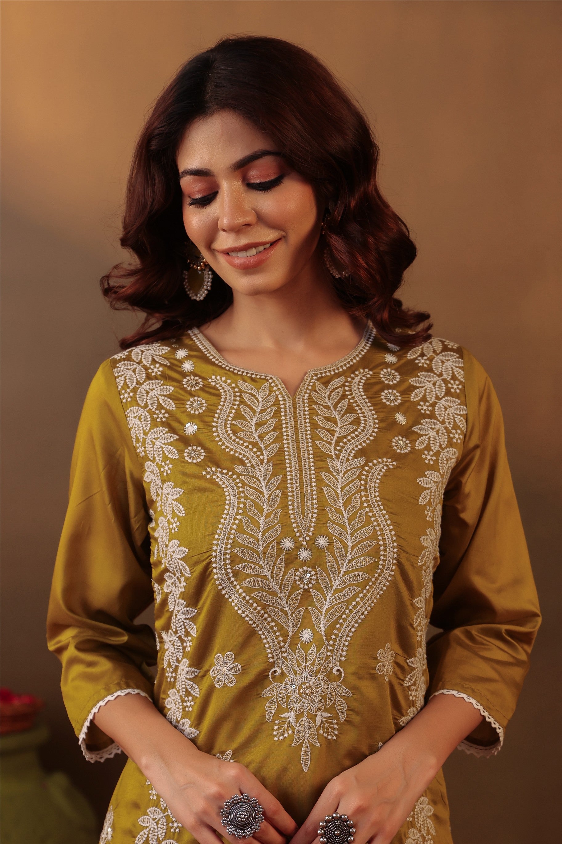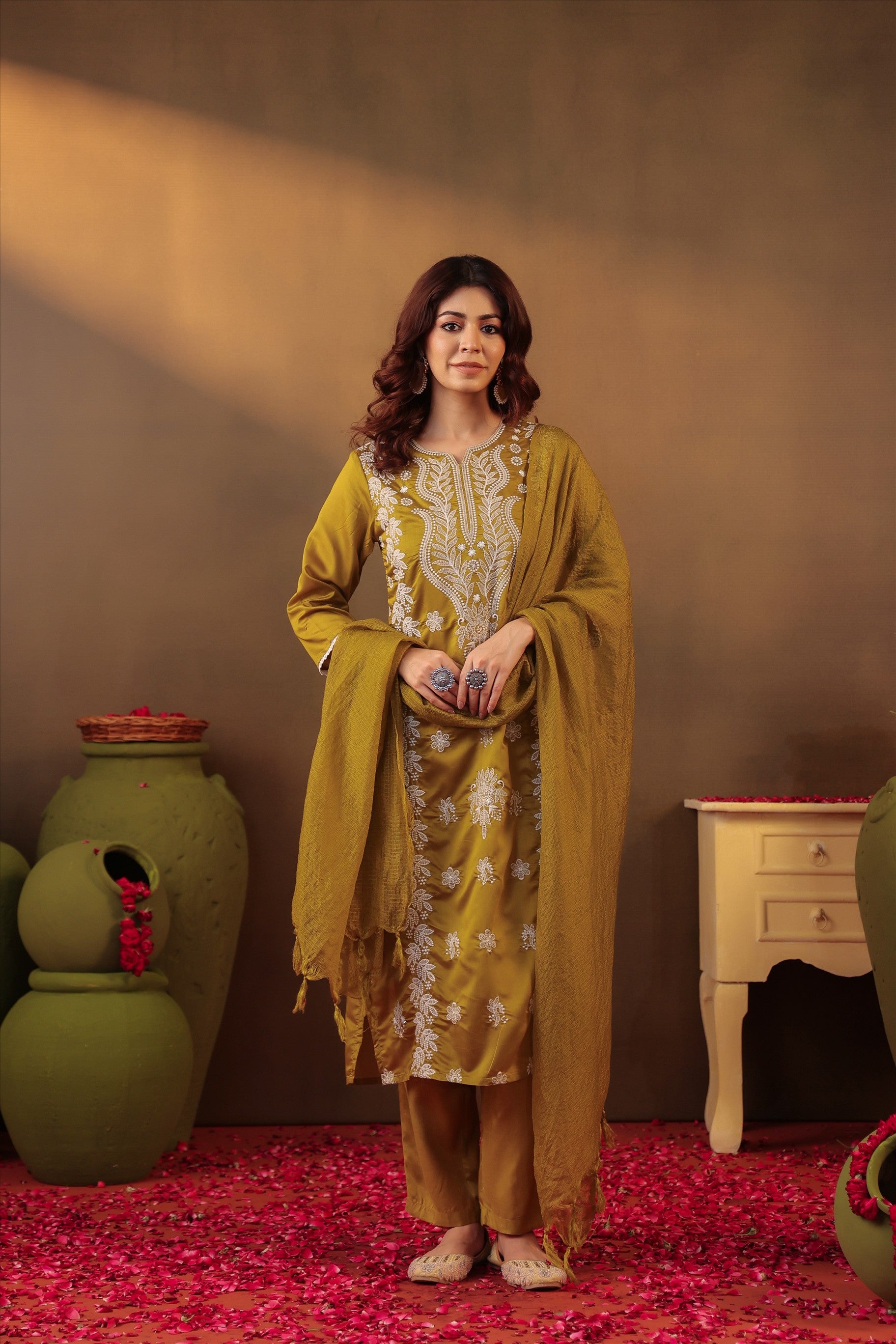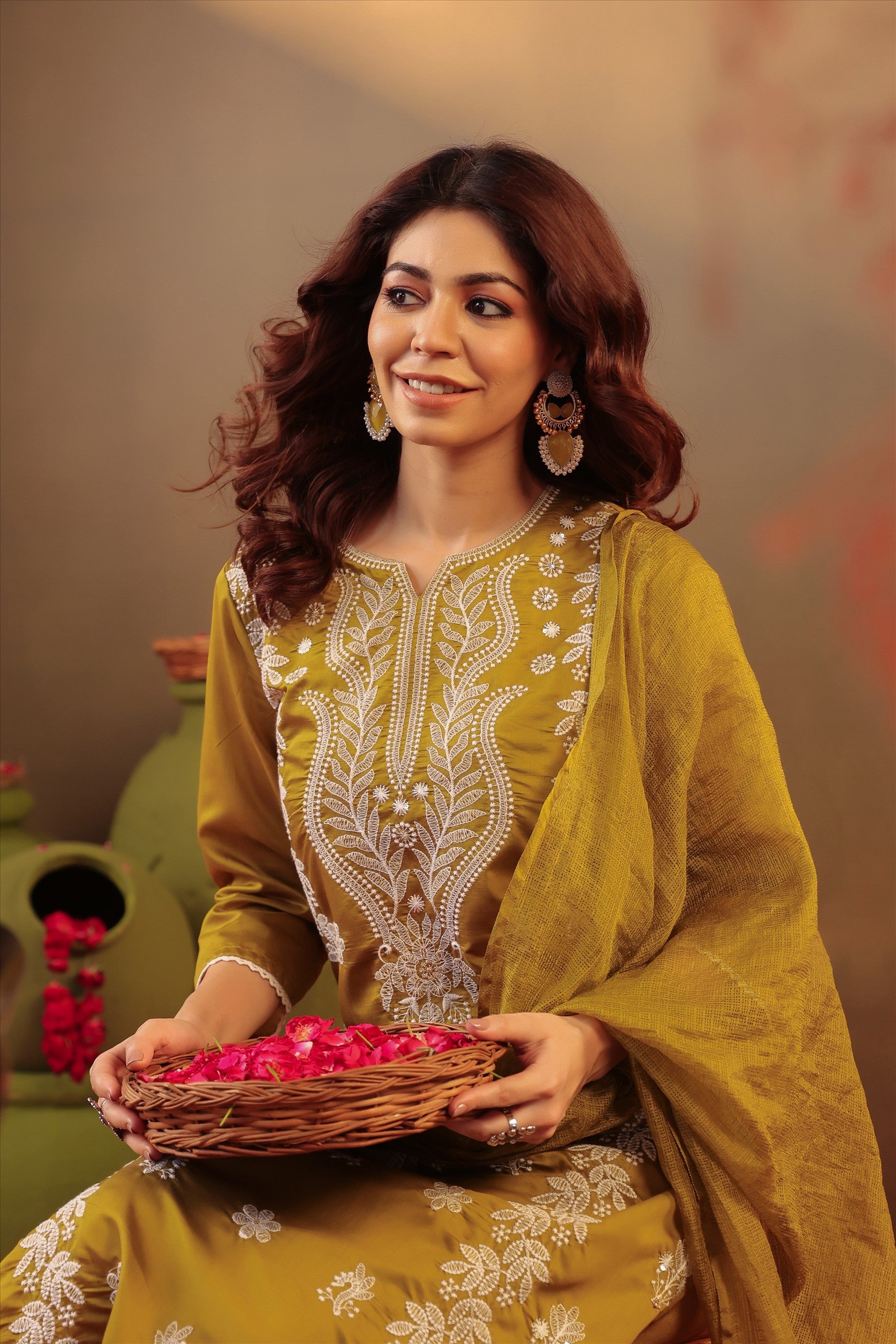 Olive Chanderi Silk Chikankari Embroidered Straight Suit Set