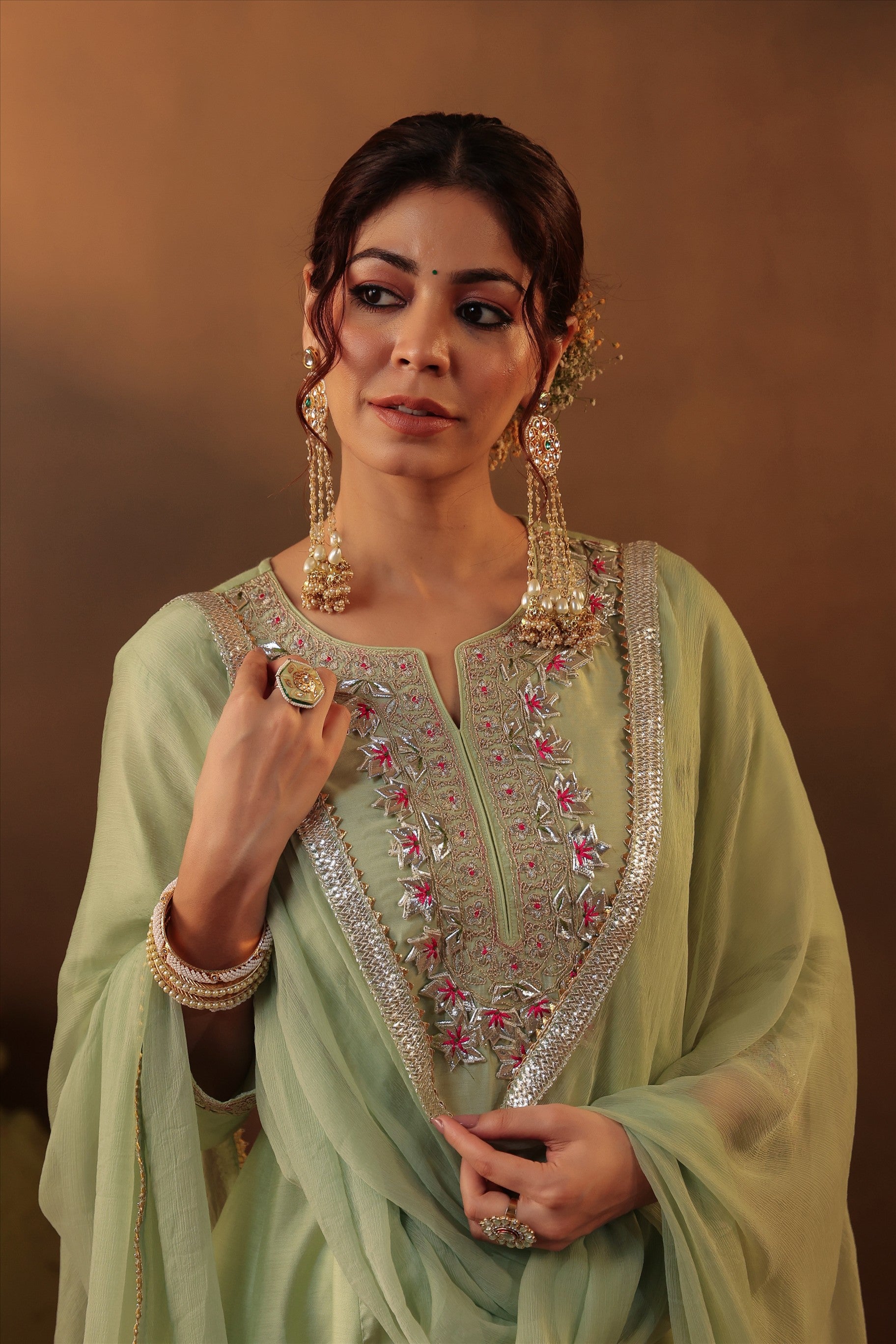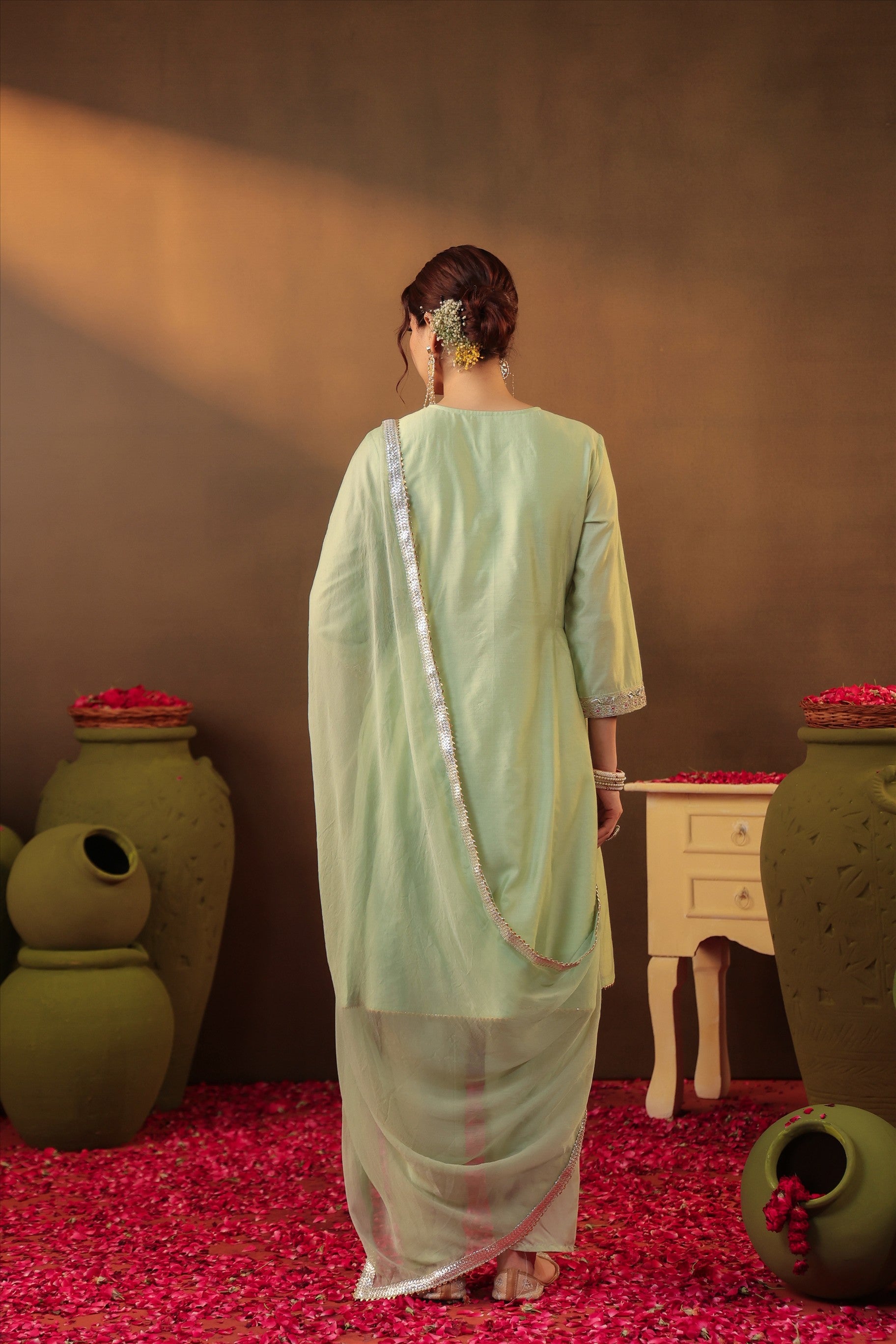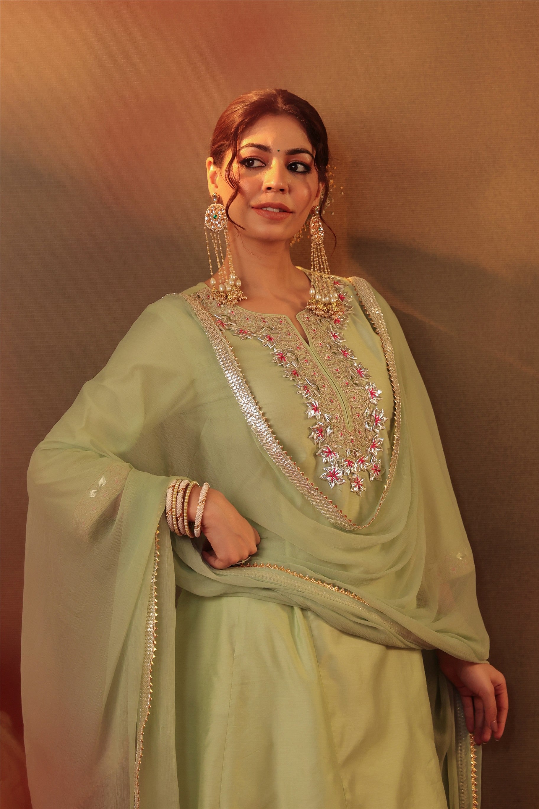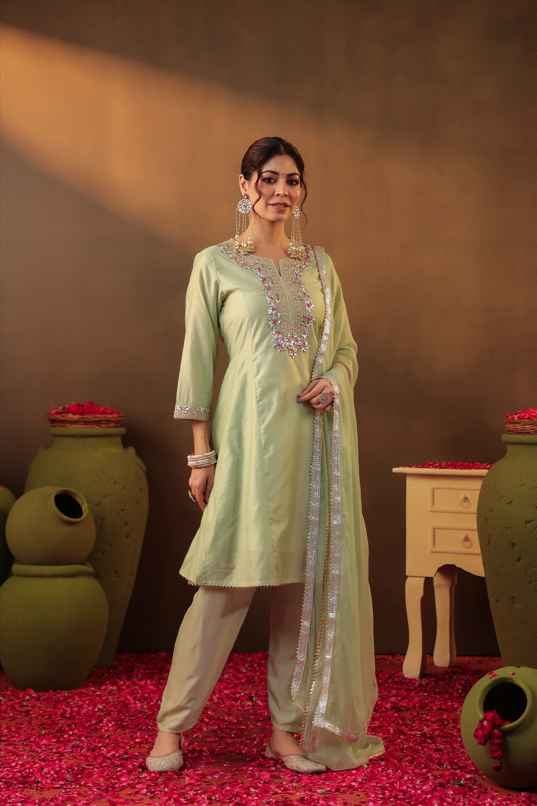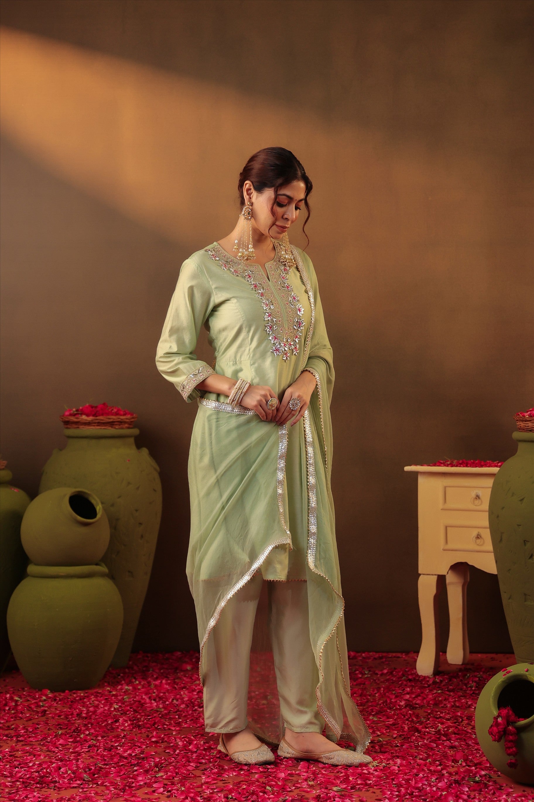 Pista Green Chanderi Silk Gota Patti Work Anarkali Suit Set