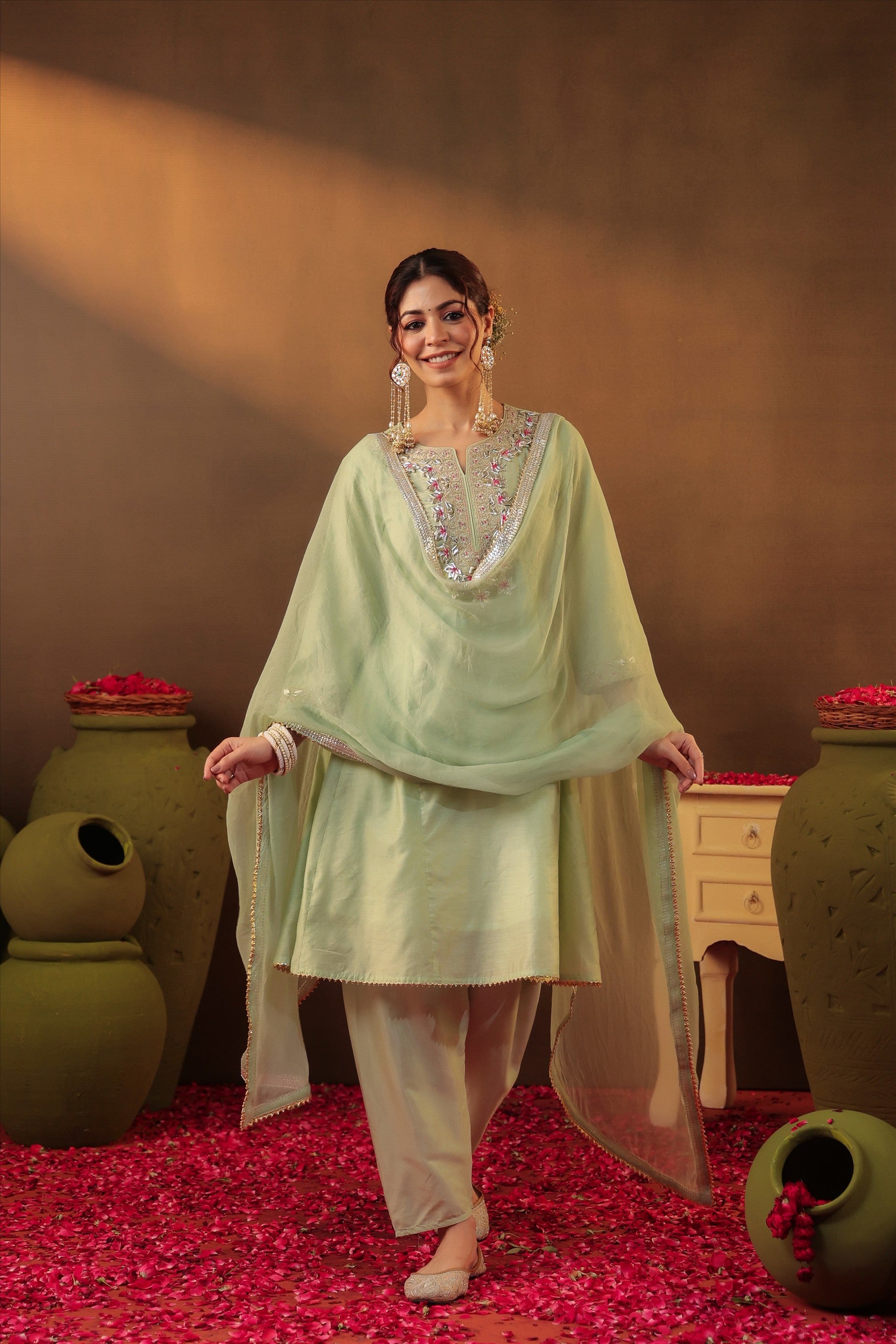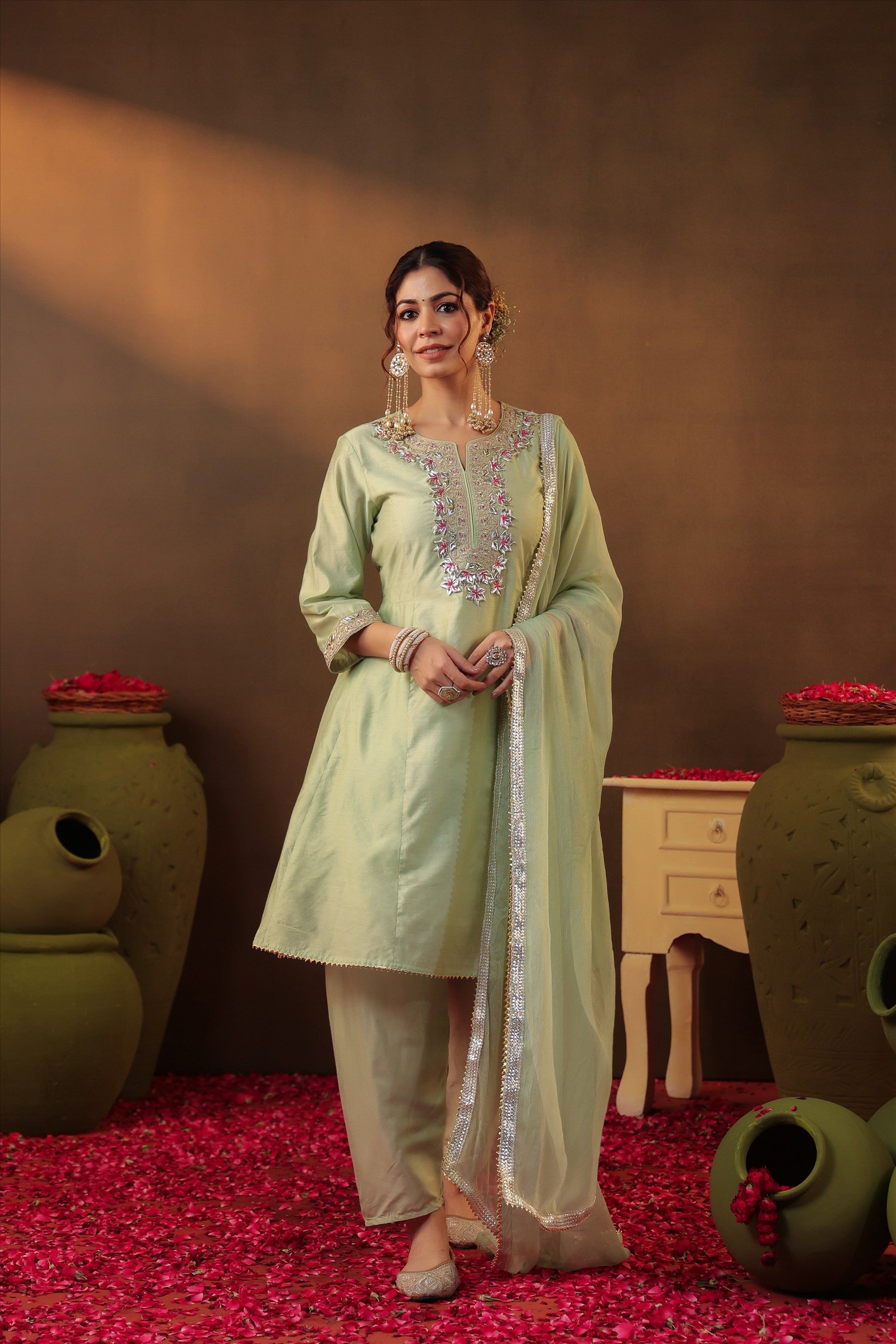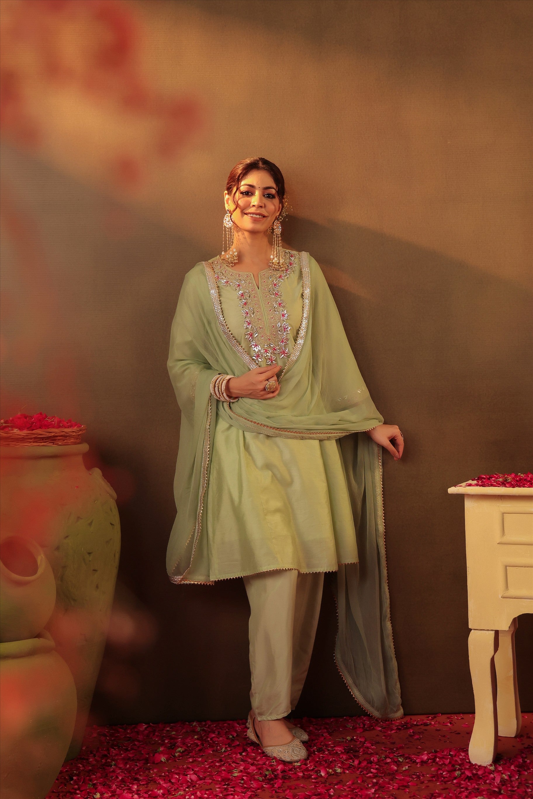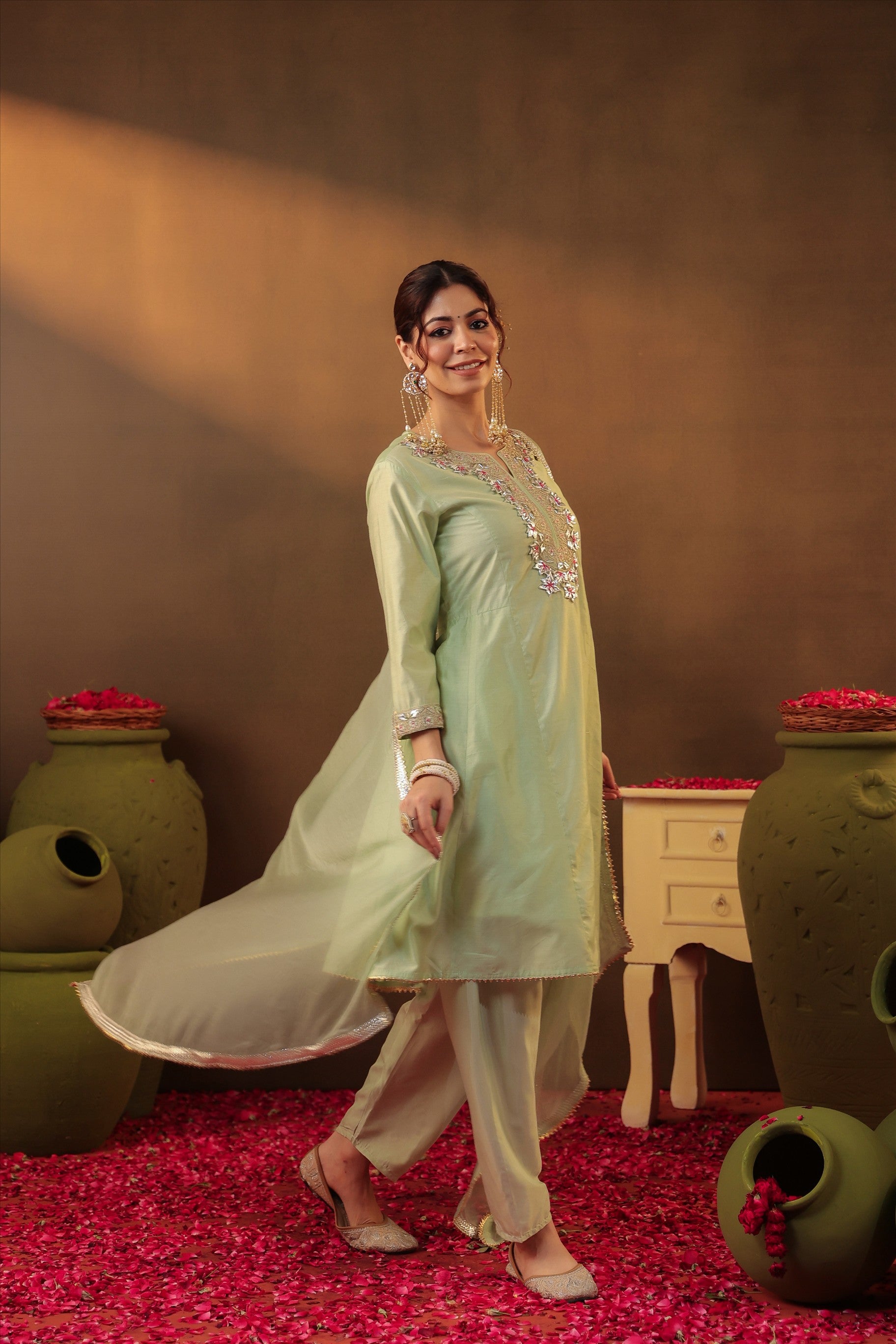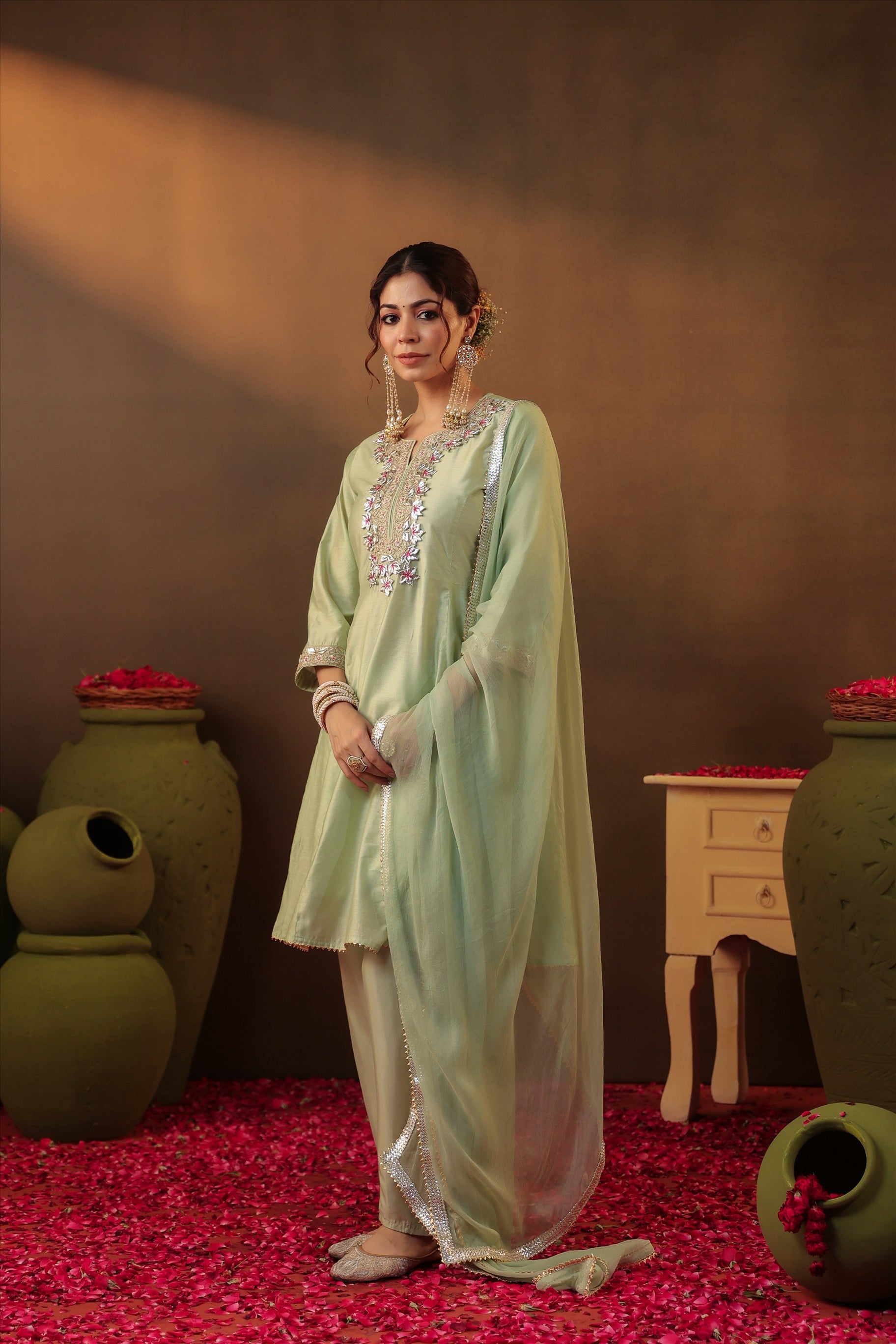 Pista Green Chanderi Silk Gota Patti Work Anarkali Suit Set