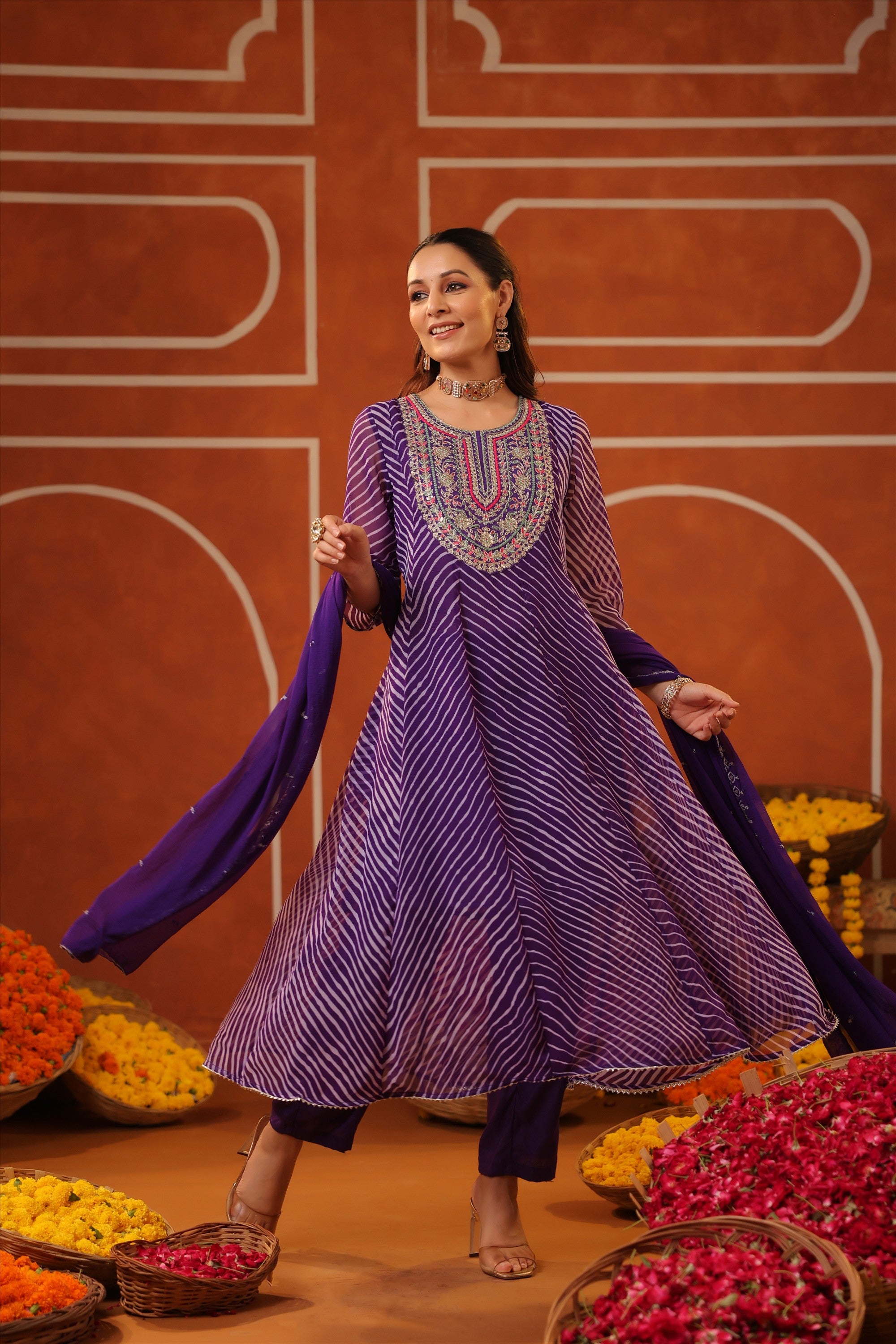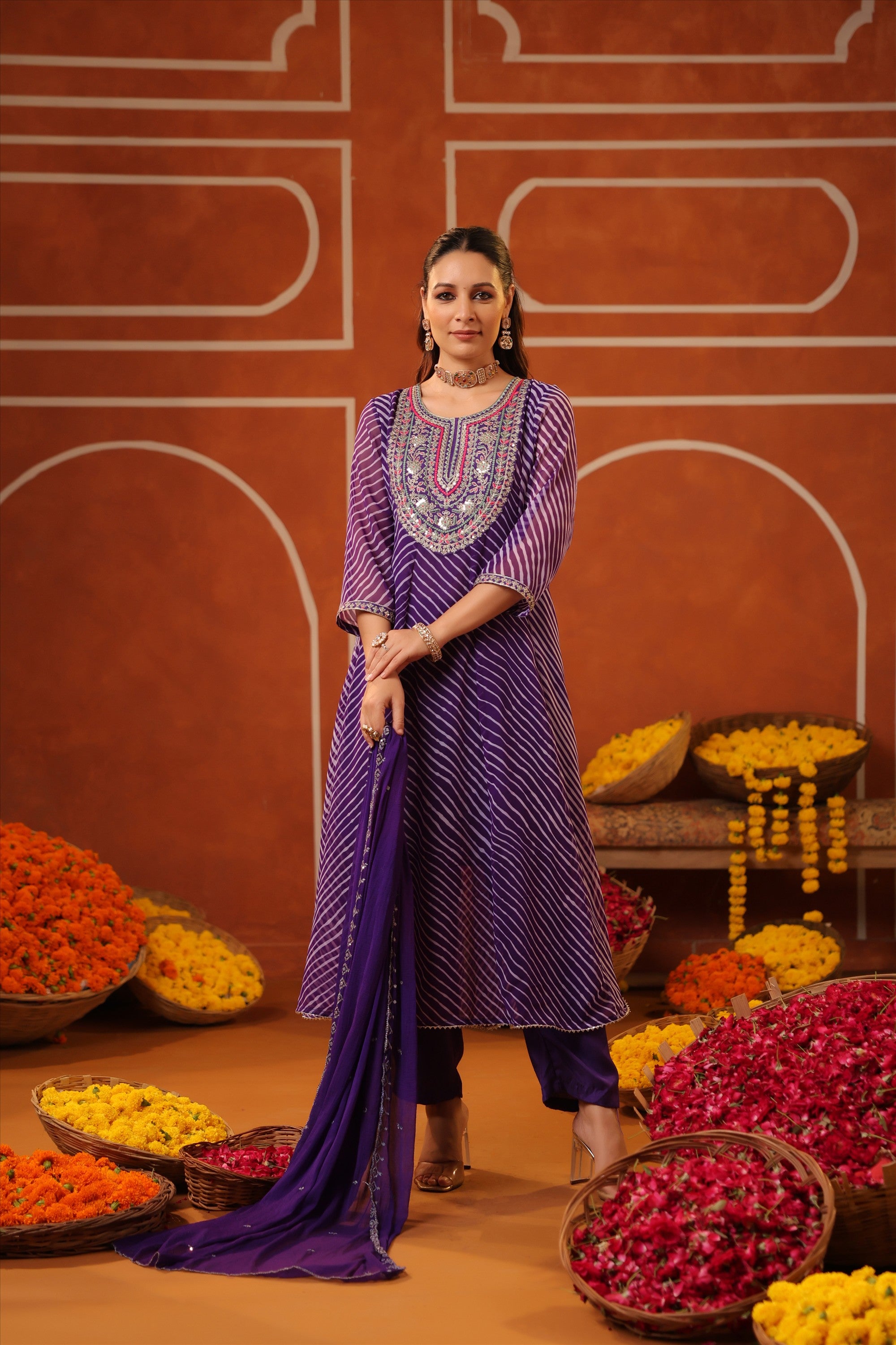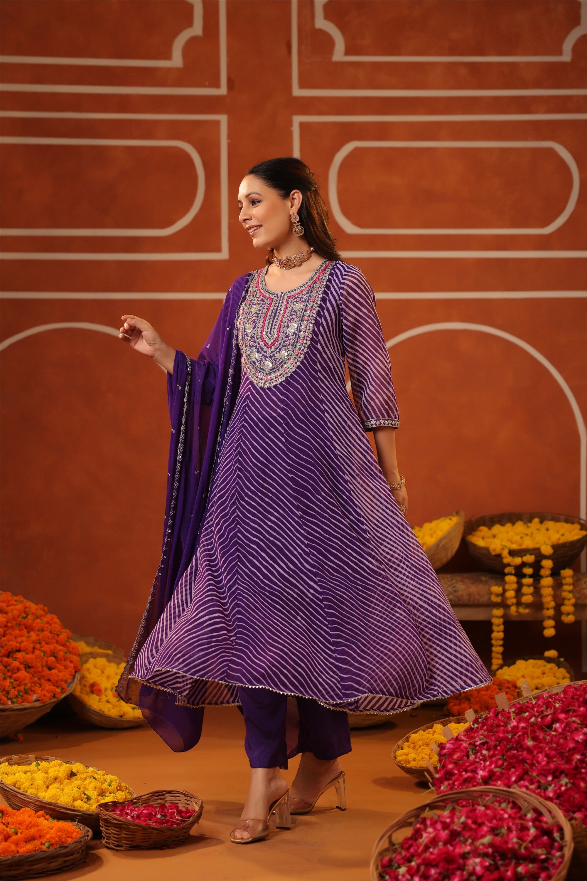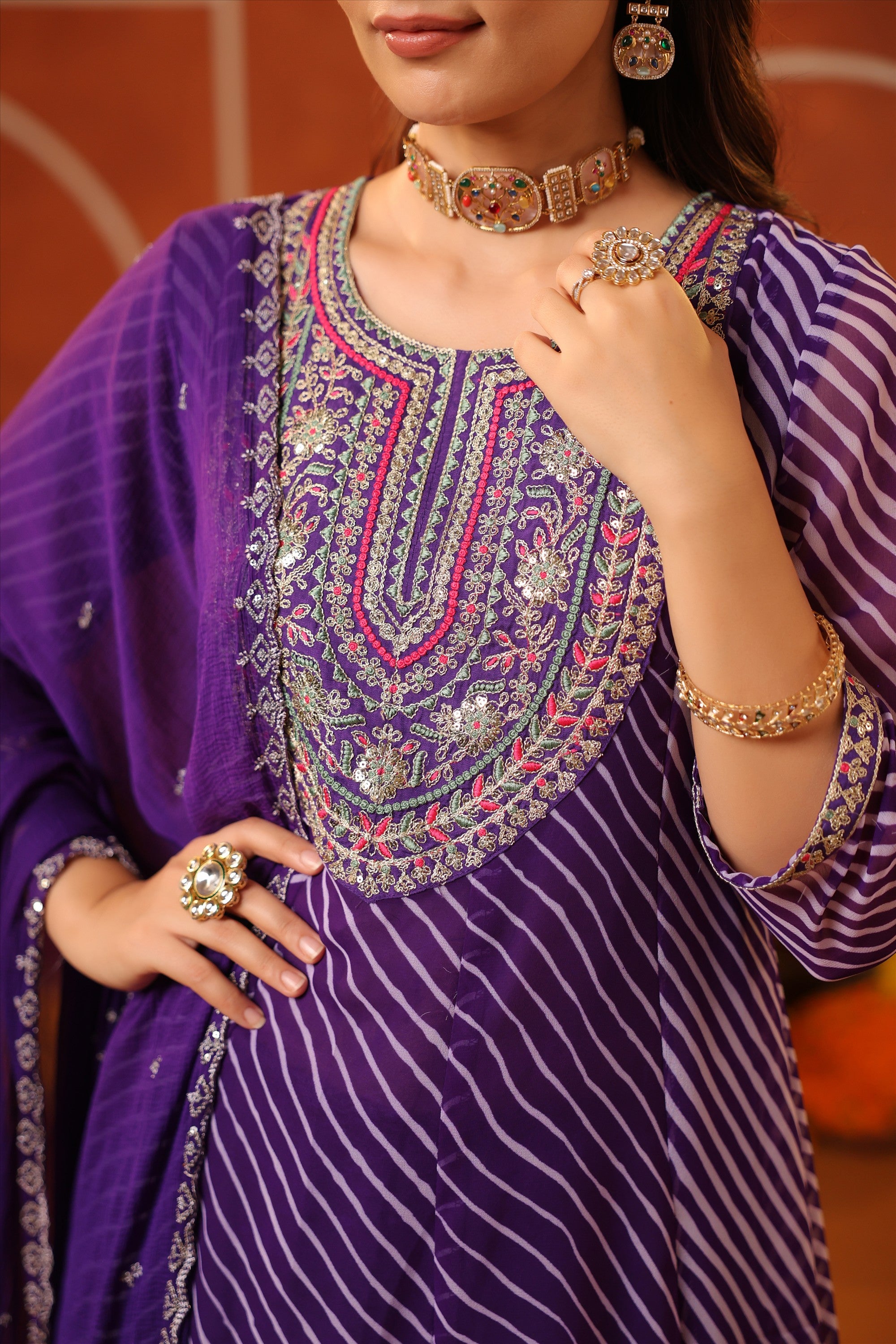 Purple Leheriya Embroidered Georgette Anarkali Suit Set
