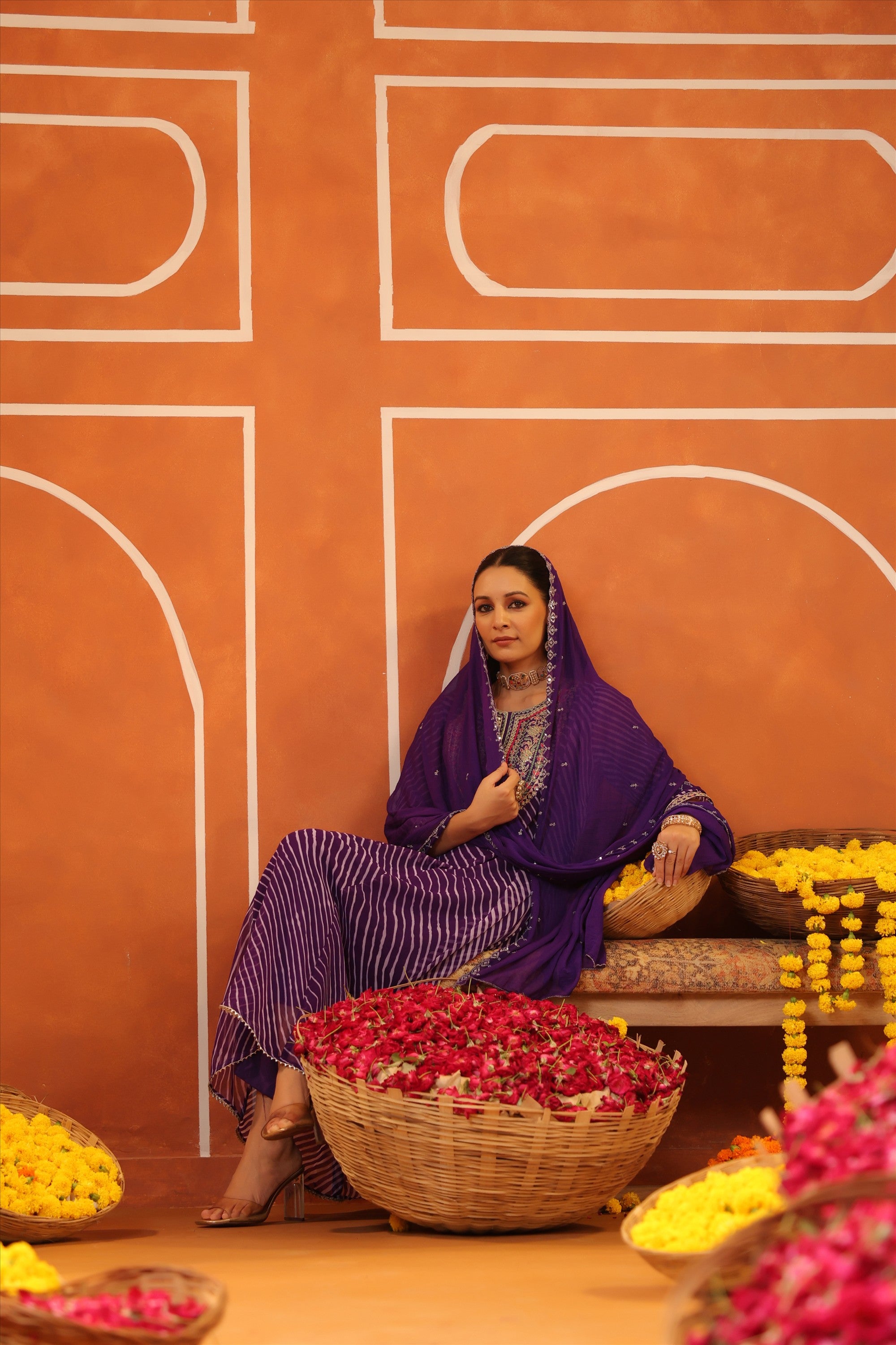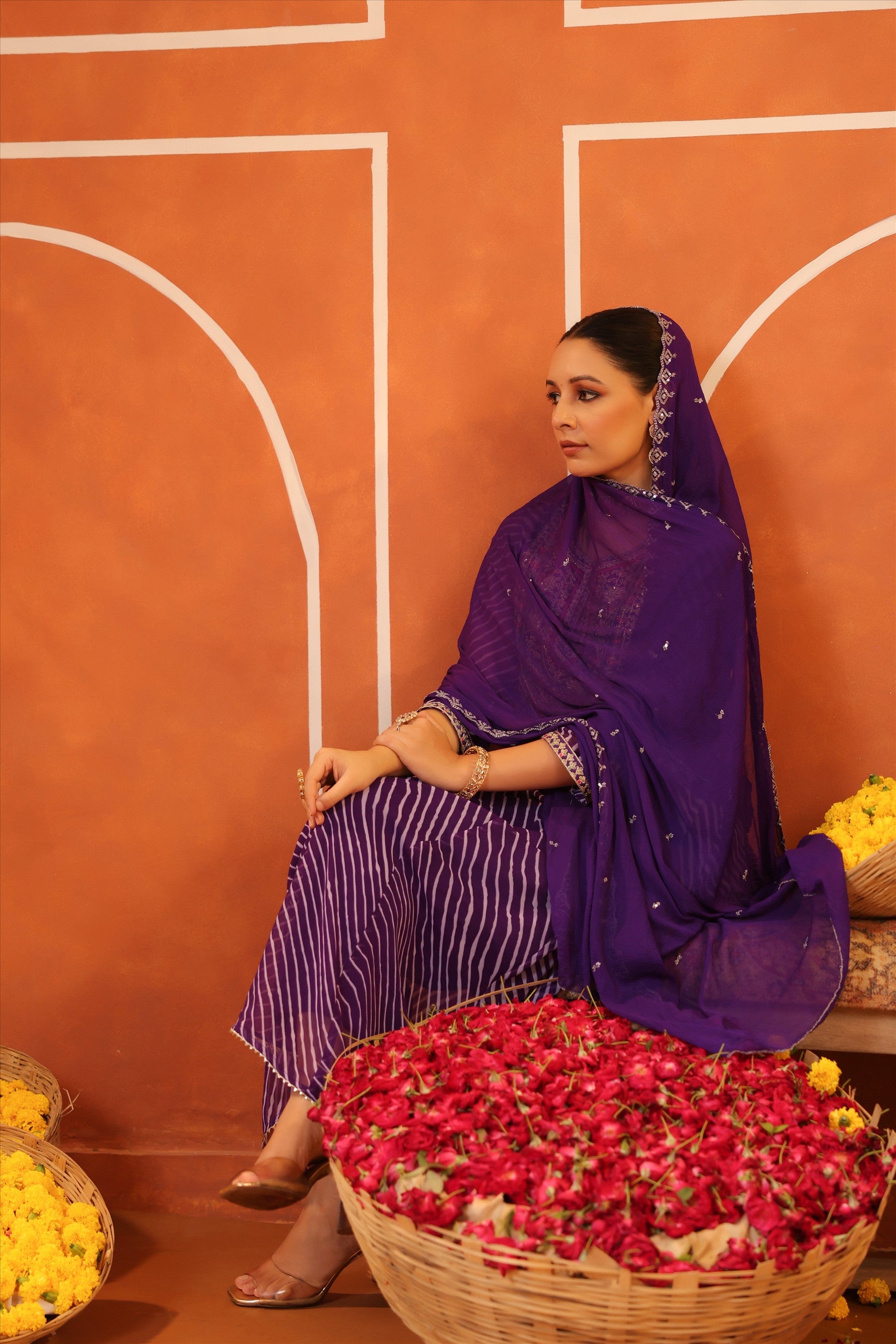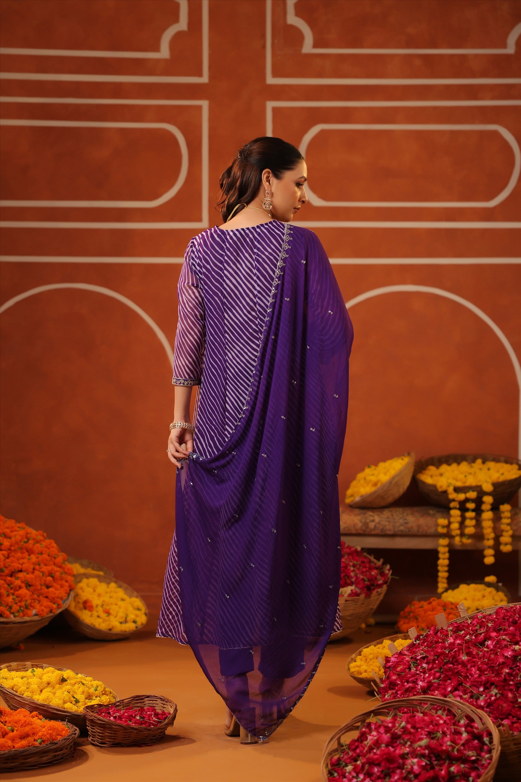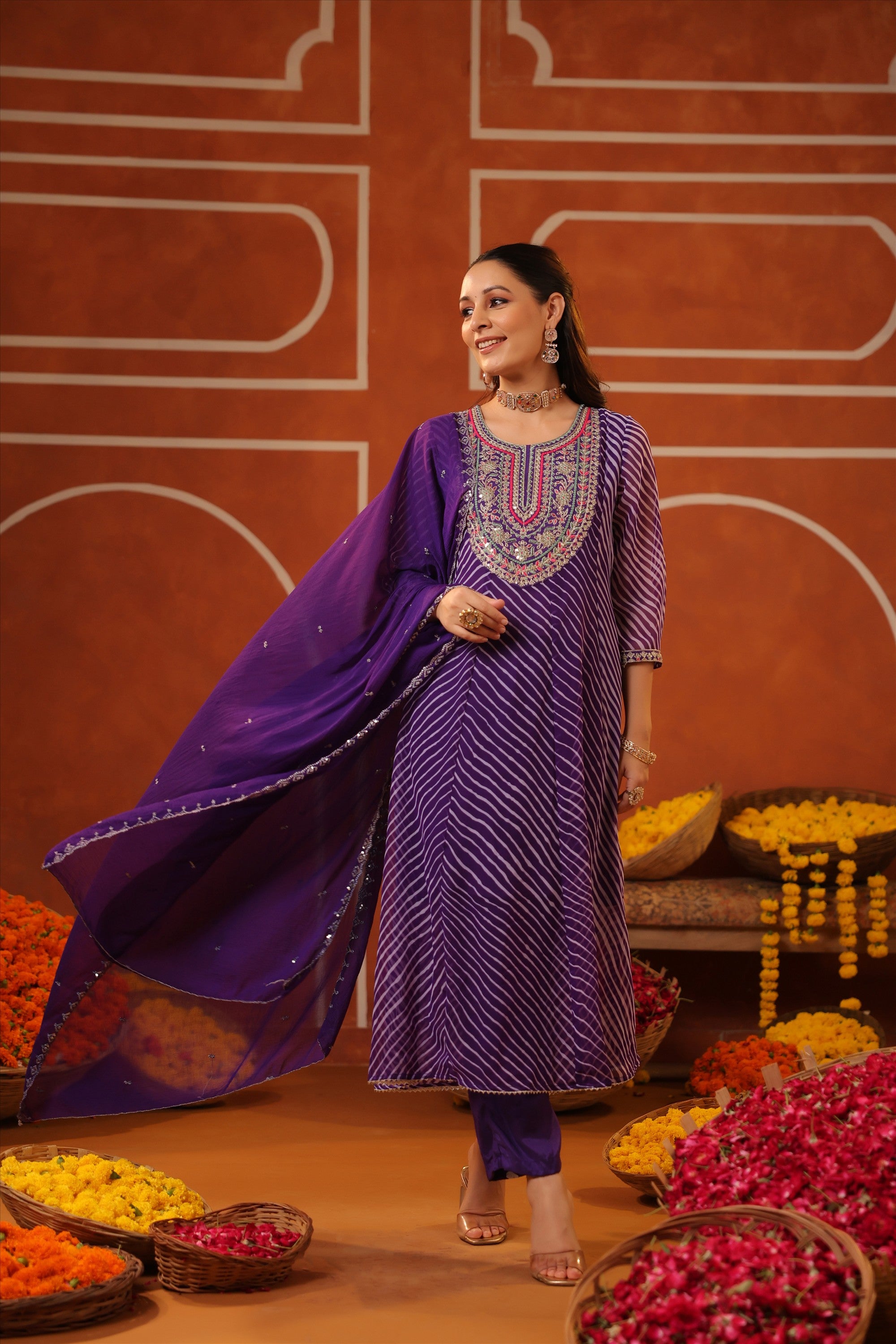 Purple Leheriya Embroidered Georgette Anarkali Suit Set