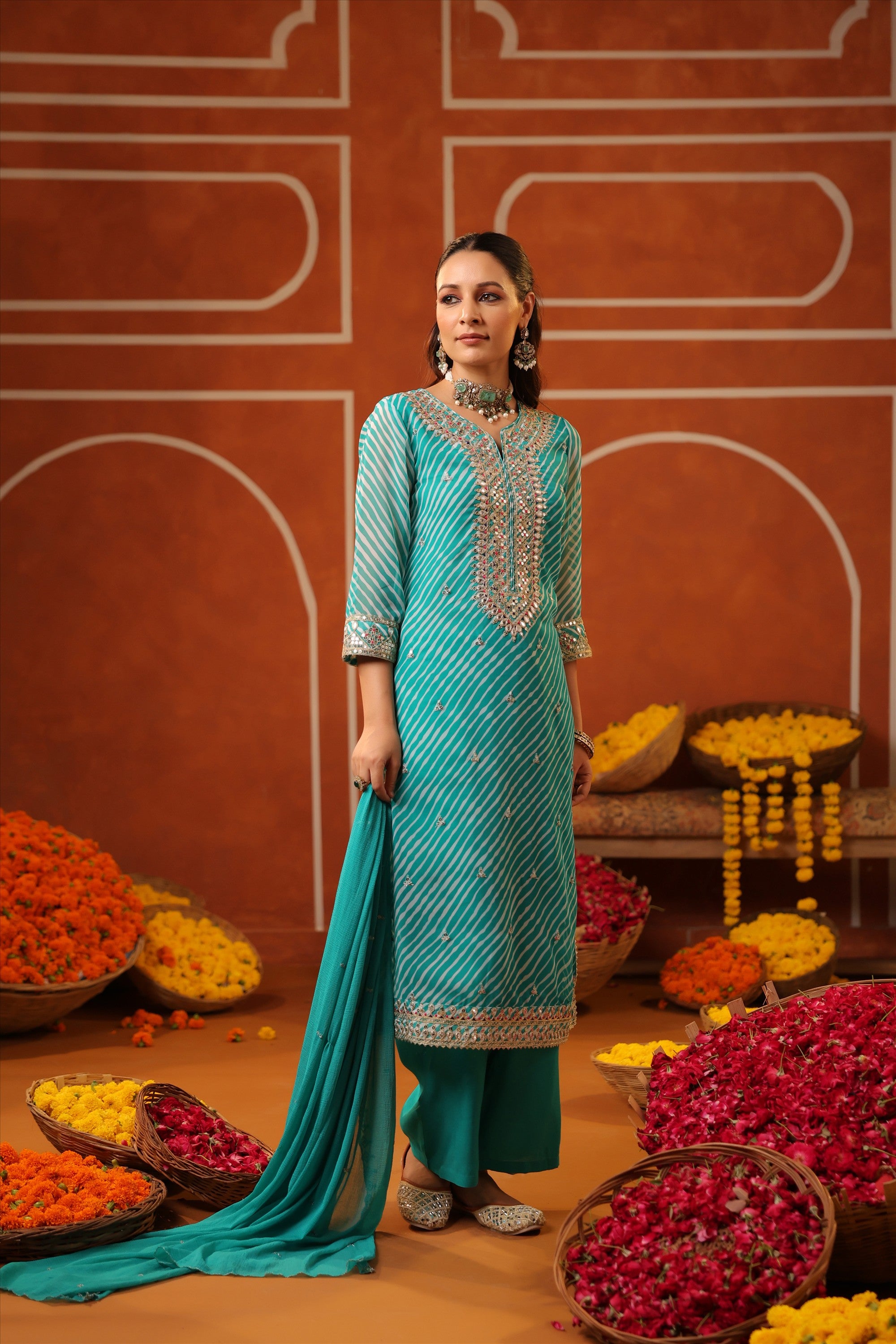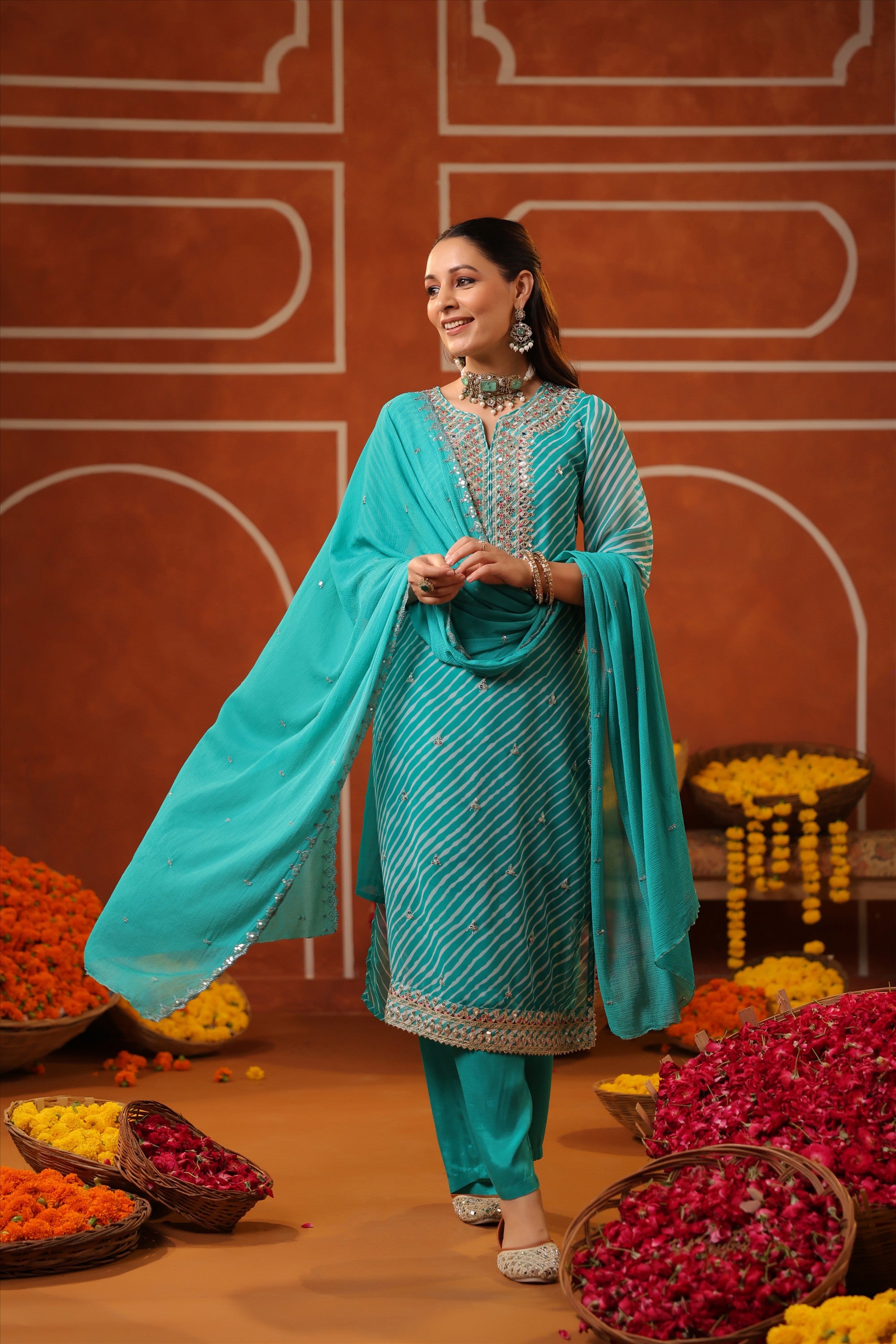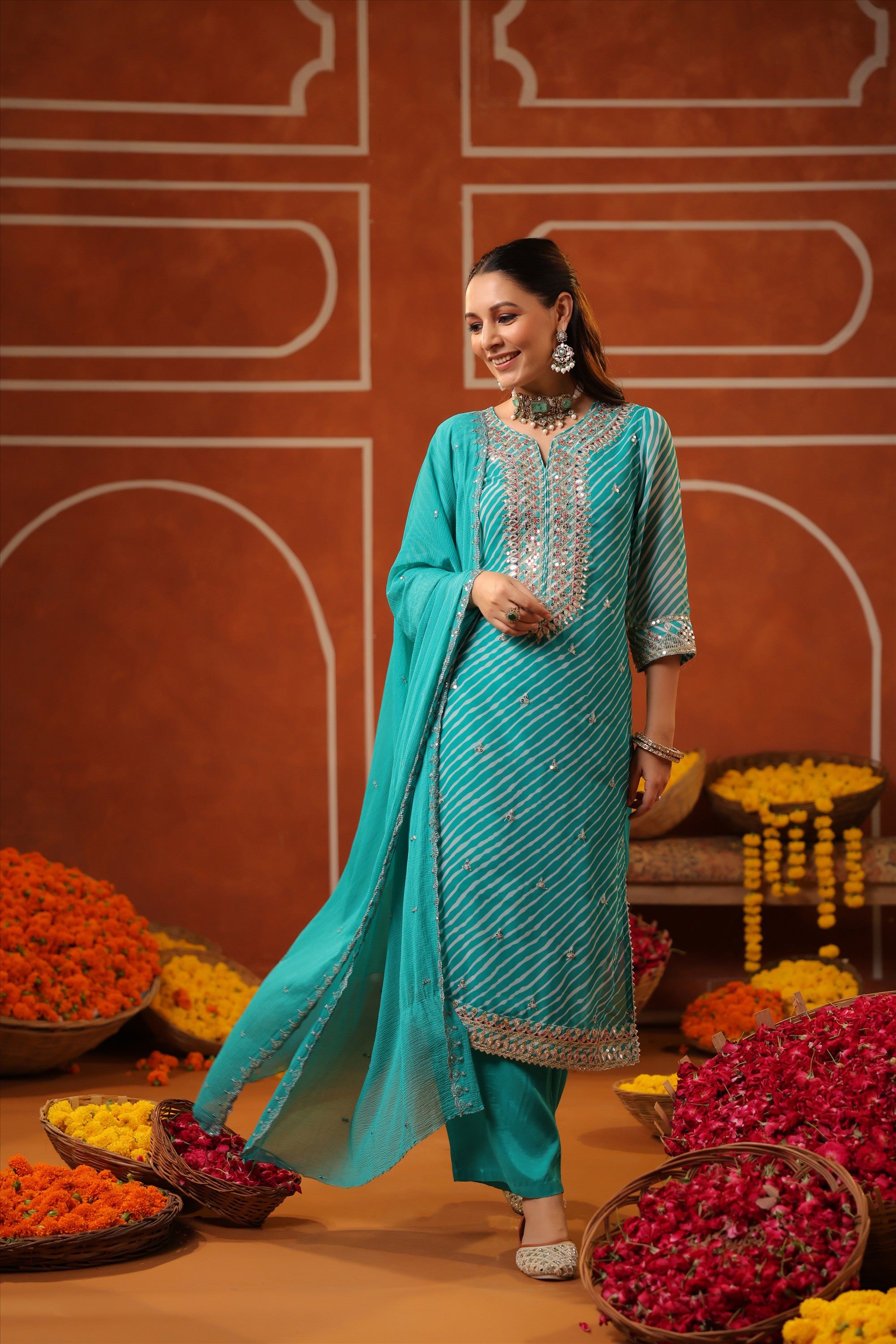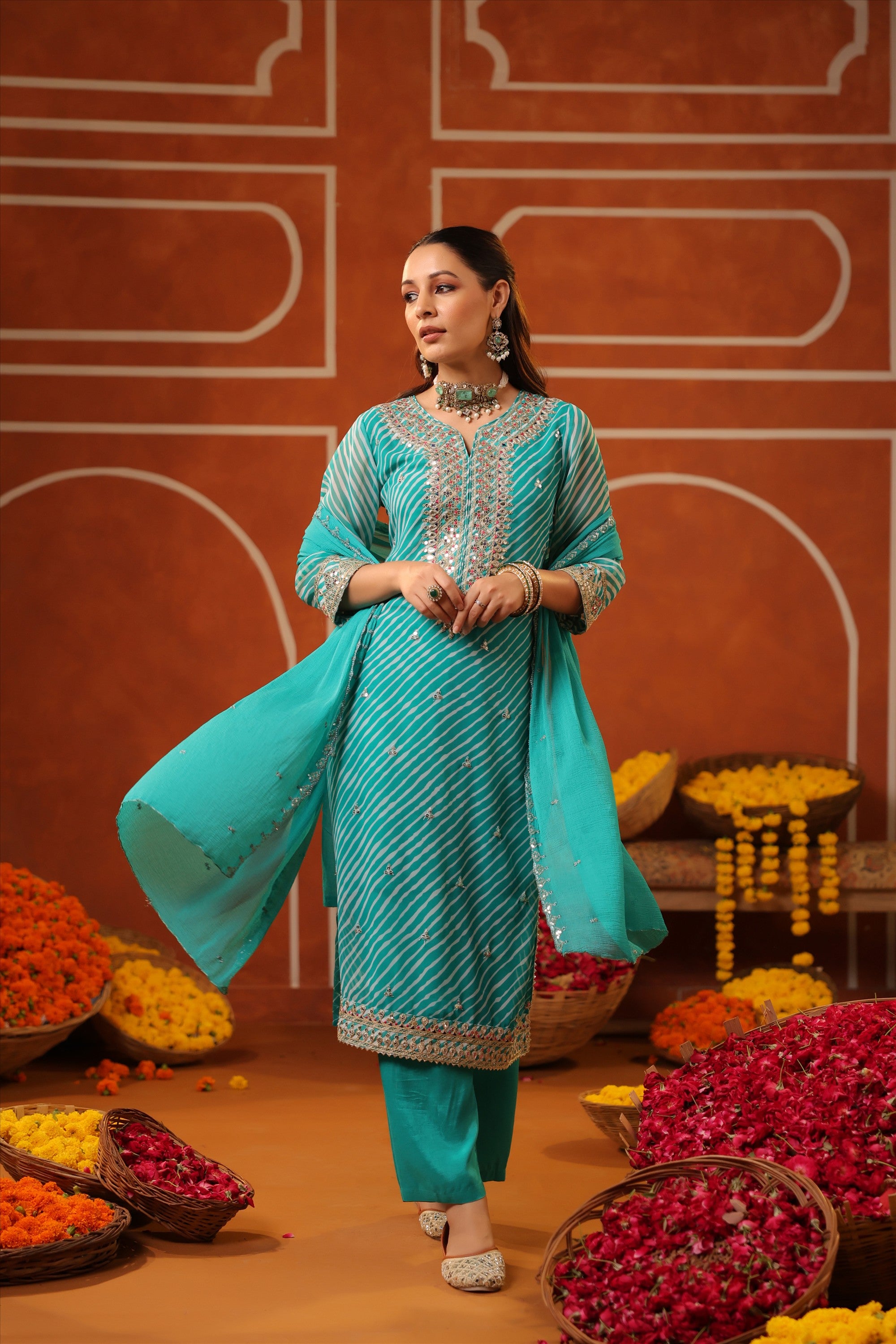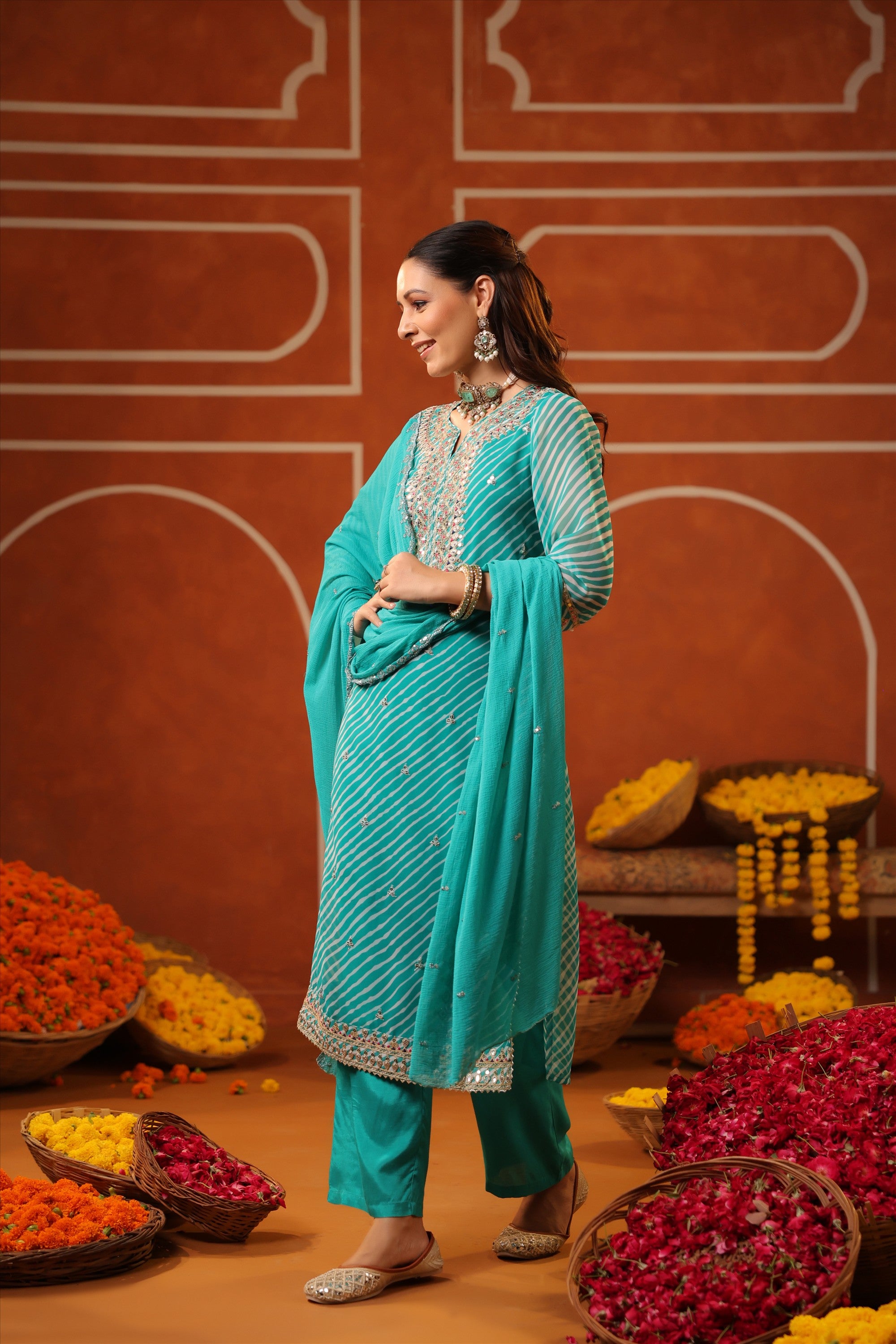 Teal Leheriya Georgette Embroidered Straight Suit Set