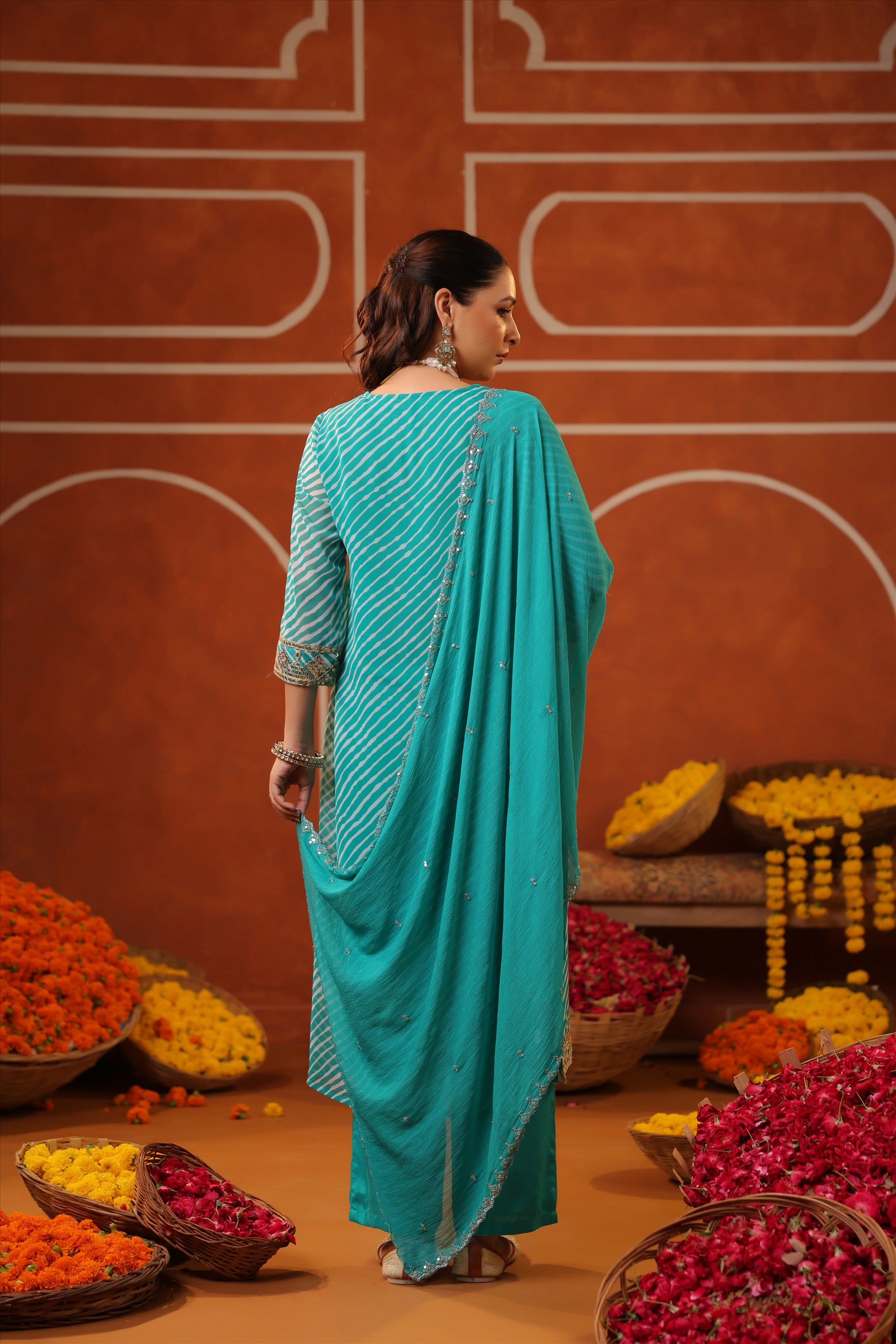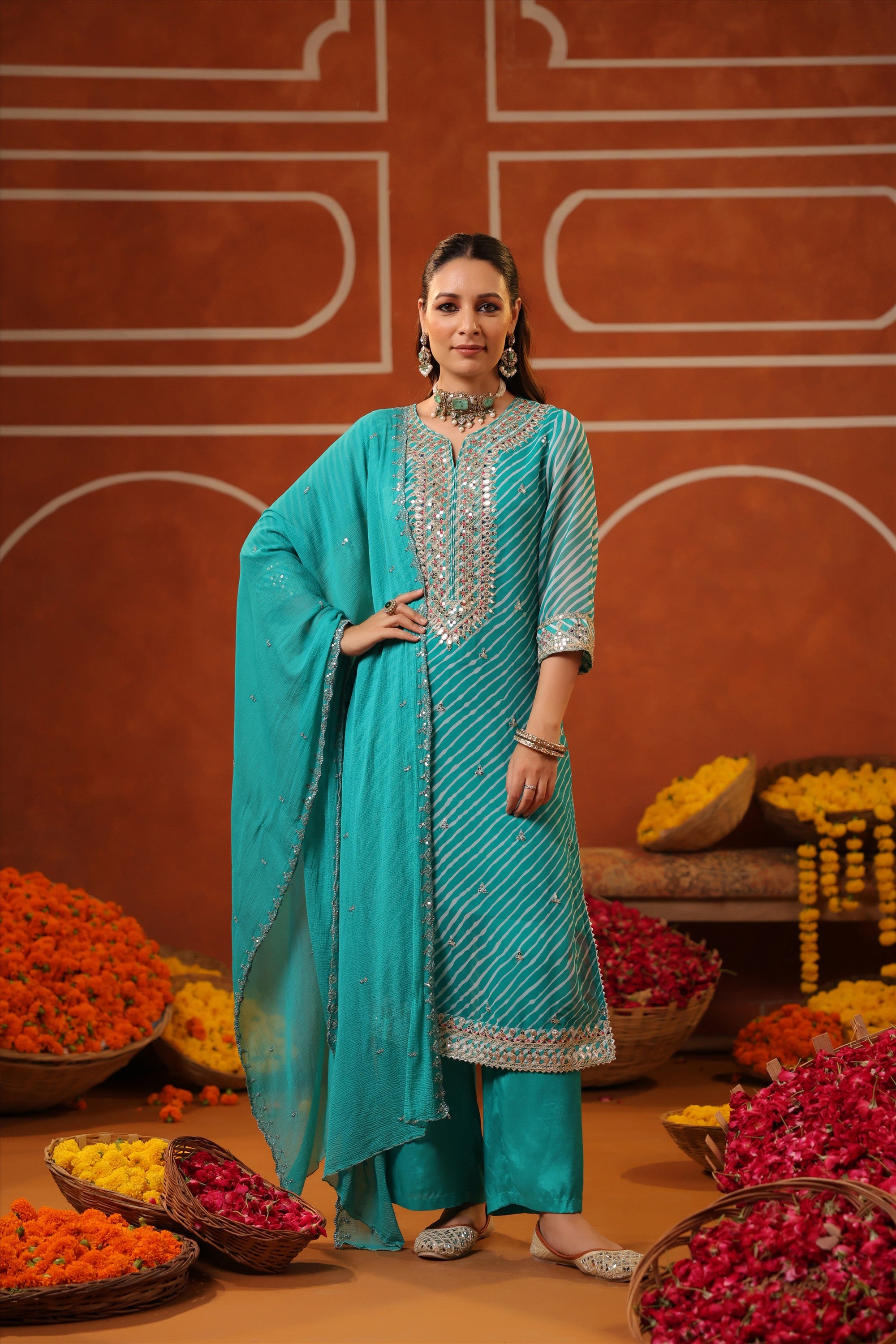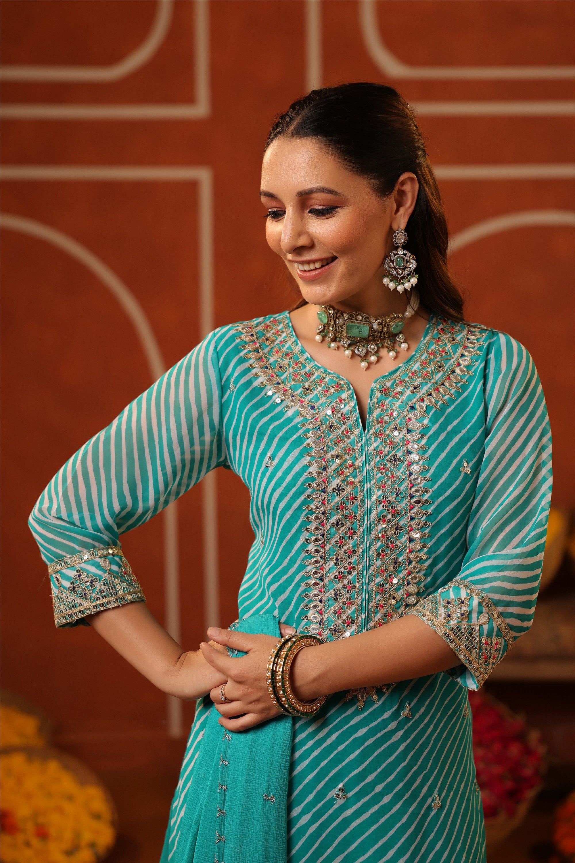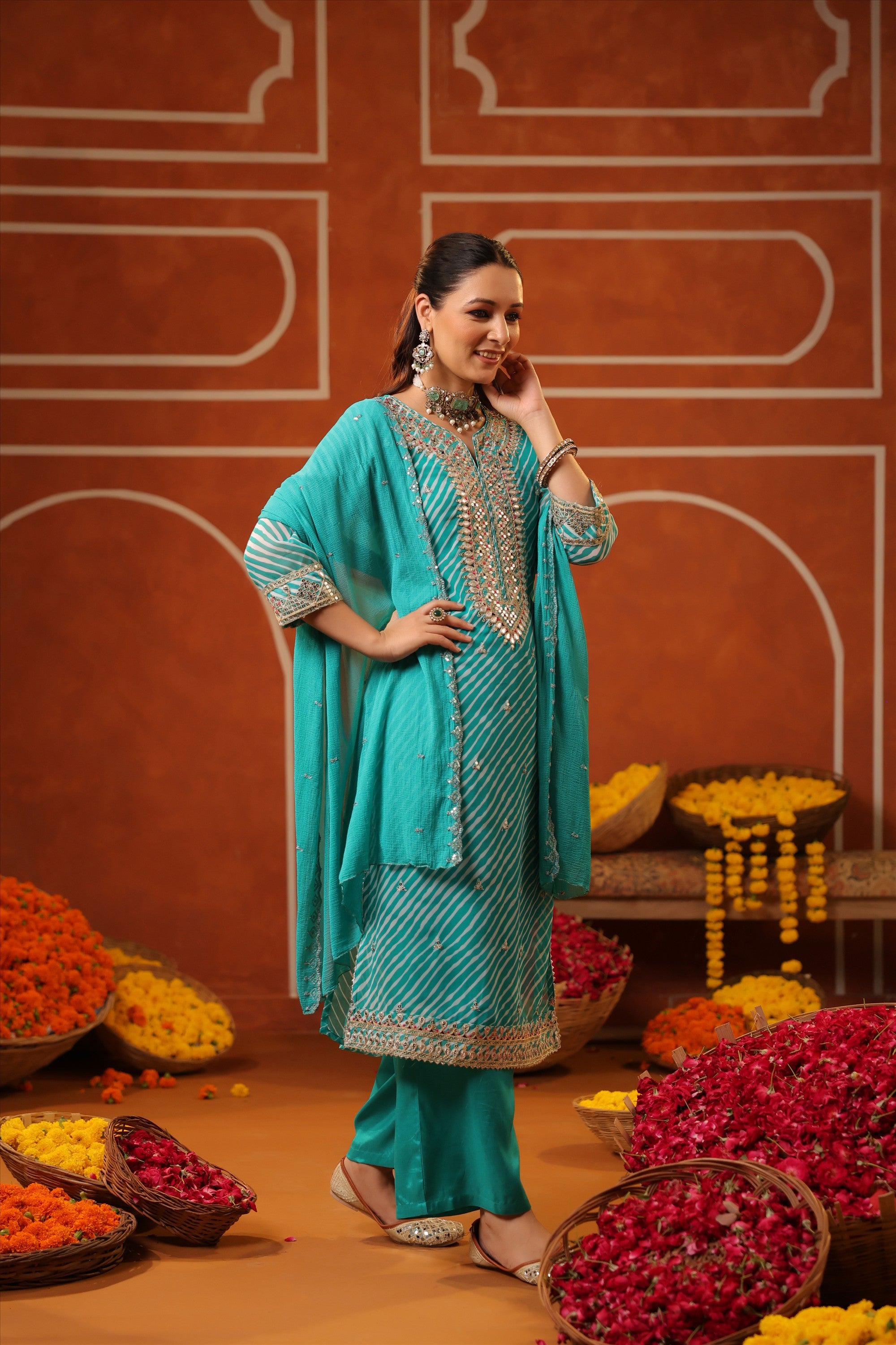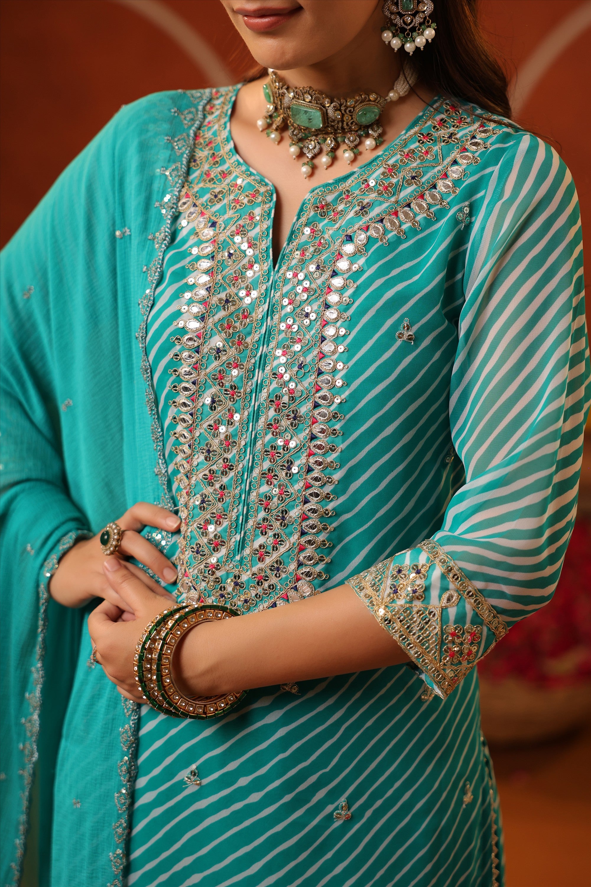 Teal Leheriya Georgette Embroidered Straight Suit Set